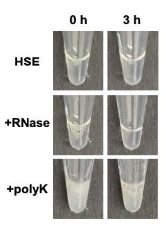 Figure S6. Aggregation assays for the ribosome-depleted high-speed extracts (HSEs). Photos are shown for HSEs at 0 h (left) and 3 h (right), without or with the addition of RNase or 1 mg/mL polylysine. Whereas polylysine addition generated immediate clouding, RNase treatment did not induce clouding over 3 h, consistent with our model that in the crude, ribosome-containing cytoplasm extract, RNase degradation of rRNA releases positively charged ribosomal proteins to cause aggregation.