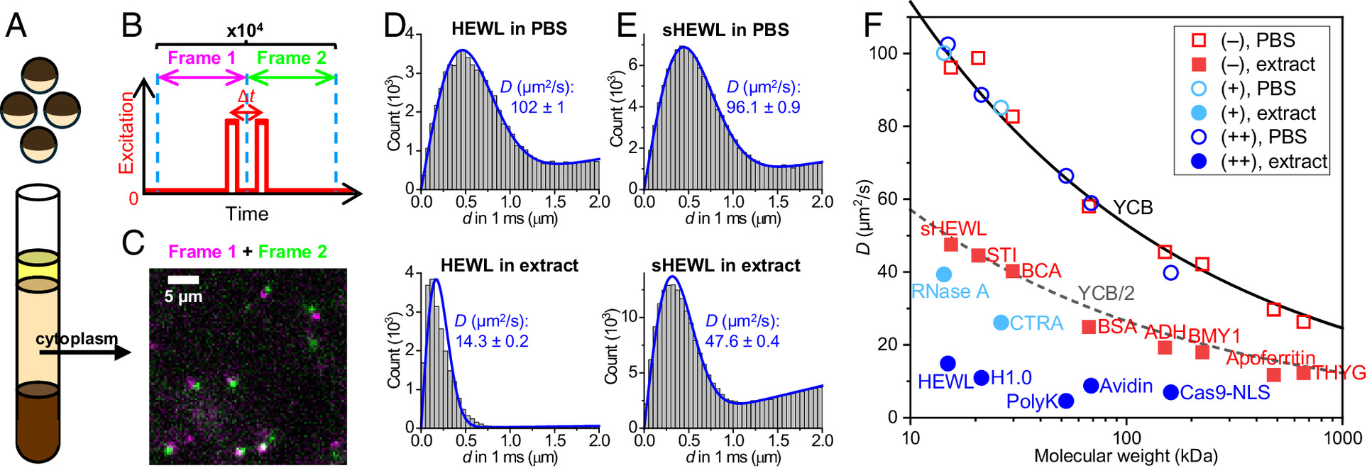 Fig. 1. SMdM-based protein diffusivity quantification in Xenopus egg extract versus in PBS. (A) Schematic: Cytoplasmic extracts from Xenopus eggs. (B) Schematic: In SMdM, paired excitation pulses are repeatedly applied across tandem camera frames, so that transient single-molecule displacements are captured in the wide field for the time window defined by the separation between the paired pulses, Δt. (C) Example single-molecule images of Cy3B-labeled bovine carbonic anhydrase diffusing in the extract, shown as a magenta-green overlaid image for a tandem pair of frames at Δt = 1 ms. (D) Example distributions of SMdM-recorded 1-ms single-molecule displacements for ~200 pM Cy3B-labeled HEWL diffusing in PBS (Top) versus in extract (Bottom). Blue curves: fits to our single-mode diffusion model, with resultant apparent diffusion coefficients D and 95% CI marked in each plot. (E) Similar to (D), but for succinylated HEWL (sHEWL). (F) SMdM-determined D values for 15 proteins of varied sizes and charges (SI Appendix, Table S1), in PBS (hollow symbols) and extract (filled symbols). Red squares: Negatively charged proteins. Blue circles: Positively charged proteins with >+5 net charges. Light-blue circles: Weakly positively charged proteins with ~+2 net charges. Each data point is an average of at least three SMdM measurements from two or more extract samples. Solid curve: Expected D in PBS at room temperature according to the Young−Carroad−Bell (YCB) model. Dashed curve: The PBS YCB values divided by 2