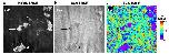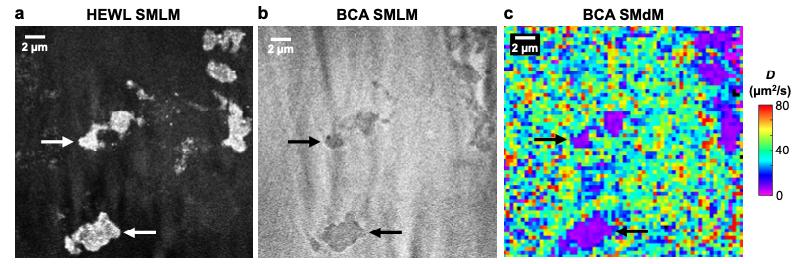 Figure S5. Diffusion of the negatively charged BCA in RNase-treated extract. (a,b) SMLM images of Cy3B-labeled HEWL (a) and CF647-labeled BCA (b) in an RNase-treated extract sample. Vertical stripe patterns are attributed to local lensing effects from the high refractive indices of the aggregates under our inclined illumination scheme (7). (c) SMdM diffusivity map of the CF647-labeled BCA. Arrows point to aggregates, where diffusivity reduction was accompanied by local increases and decreases in the abundances of HEWL and BCA, respectively. These results may be interpreted as that as the RNase-released positively charged proteins interact with the negatively charged cytoplasm environment, the resultant aggregates are overwhelmed by the latter on the surface. Positively and negatively charged tracer proteins are thus respectively attracted to and repelled by the aggregates, with the former further likely participating in the aggregate cores.