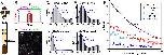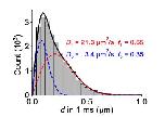 Figure S2. Two-component D fit to the distribution of SMdM-recorded 1-ms single-molecule displacements of Cy3B-labeled HEWL diffusing in extract as shown in Fig. 1d. Histogram: displacements; Red curve: fast component of the fit (D1 = 21.3 μm2/s, fraction f1 = 0.65); Blue curve: slow component of the fit (D2 = 3.4 μm2/s, fraction f2 = 0.35); Black curve: sum of the red and blue curves. While the two-component fit improves over the single-component model (Fig. 1d), the system may be better assumed as a continuous distribution of different transient states.