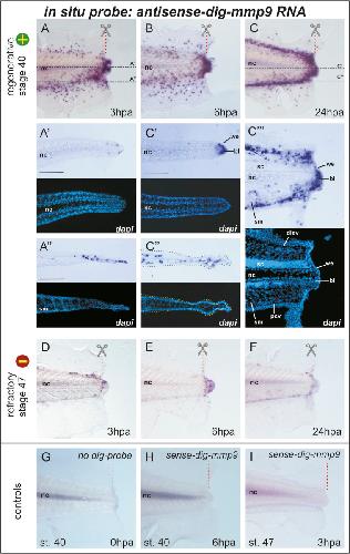 Whole-mount in situ hybridization (WISH) is a widely used method that supports the concept of "seeing is believing" by enabling the visualization of gene expression patterns in whole-mount multicellular samples or sections. This technique is essential in the study of epimorphic regeneration in cold-blooded vertebrates, where complex three-dimensional organs such as tails, limbs, and eyes are completely restored after loss. The tadpoles of the frog X. laevis serve as a convenient model for studying regeneration, as they can regenerate their tails within a week after amputation. Modern high-throughput sequencing methods have identified various cell populations involved in the regeneration process and determined the repertoire of genes activated during this time. Specifically, a population of reparative myeloid cells expressing mmp9 as a marker gene has been shown to be crucial for the initial stages of tail regeneration in X. laevis tadpoles. The validation of these data and further examination using WISH offers the advantage of providing detailed information on the spatial and temporal dynamics of target gene expression levels. However, detecting mRNA by WISH can be challenging when mRNA levels are very low, transcripts are localized in hard-to-access areas, or tissue samples are prone to background staining, as is the case with X. laevis regenerating tail samples. Here, we describe additional treatments for regenerating tail samples that minimize background staining and enhance the visualization of cells containing target RNA through in situ hybridization. Using an optimized WISH protocol on X. laevis tadpole tail regenerates, we obtained novel data on the mmp9 expression pattern during the first day post-amputation at the regeneration-competent stage 40 and the regeneration-incompetent stage 47 (refractory period). The significant differences in the expression patterns indicate that mmp9 activity is positively correlated with regeneration competence.