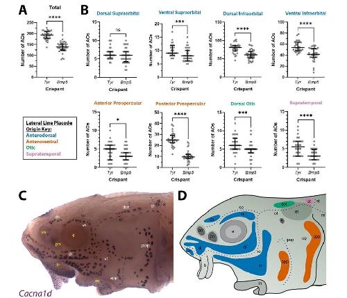 ampullary organs. The higher power view shows the posterior preopercular ampullary organ field. (C444 F) In Bmp5 crispants, Cacna1d expression reveals fewer ampullary organs (compare C,E with A); this