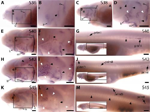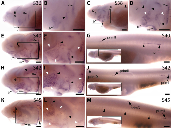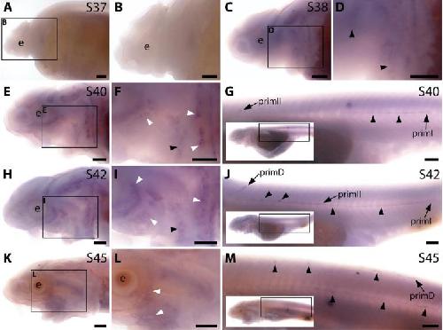 Figure 3—figure supplement 2. Sterlet Sostdc1 is expressed in neuromasts but only transiently in ampullary organs.In situ hybridisation in sterlet for Sostdc1, encoding a secreted dual Wnt/Bmp antagonist. Black arrowheads indicate examples of developing neuromasts; white arrowheads indicate examples of developing ampullary organs. For trunk images, boxes on low-power insets delineate the regions shown. Non-lateral line expression is seen in developing gill filaments. (A–D) Sostdc1 expression is seen in neuromasts on the head from stage 36 (A,B), persisting at stage 38 (C,D). (E–G) At stage 40, expression is maintained in neuromasts on the head (E,F) and is also visible in the three migrating lateral line primordia on the trunk and in trunk neuromasts (G). (H–J) At stage 42, Sostdc1 expression persists in cranial neuromasts and is now also seen in ampullary organs (H,I). On the trunk, expression persists in the migrating primordia and neuromasts (J). (K–M) By stage 45, only neuromast expression is observed on the head (K,L). On the trunk, expression continues in the migrating primordia and neuromasts (M). Abbreviations: e, eye; prim, migrating lateral line primordium (primI, primary; primII, secondary; primD, dorsal); S, stage. Scale bar: 250 μm. |