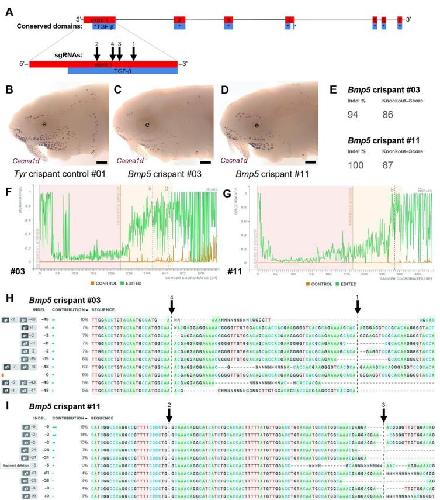 each of the Bmp5 crispants shown in panels C and D. ‘Indel %’ (E) gives the percentage of insertions