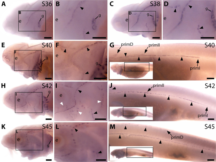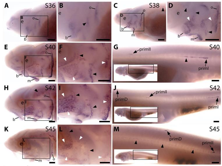 On the trunk, expression persists in the migrating primordia and neuromasts (J). (K-M) By stage 45,