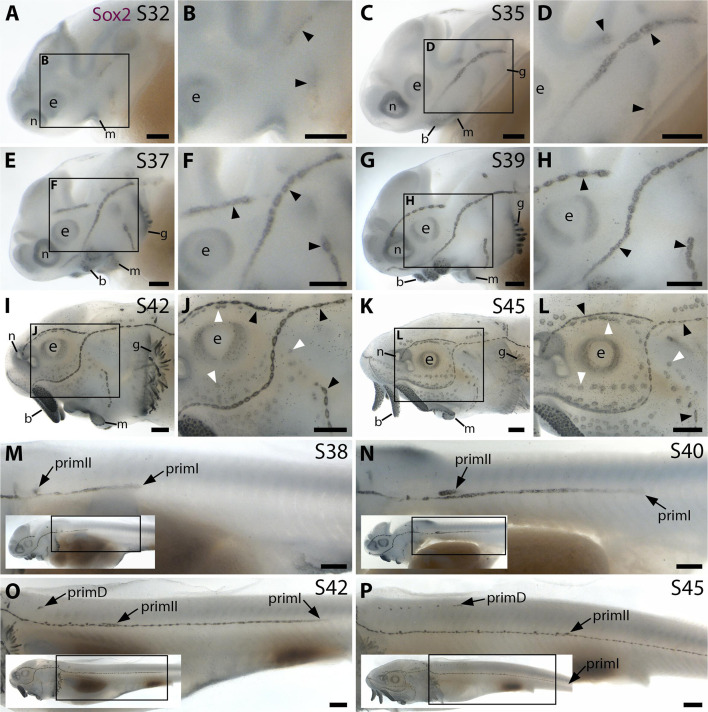 comparison, Sox2 expression is strong in primII, primD and all neuromasts; arrowheads indicate