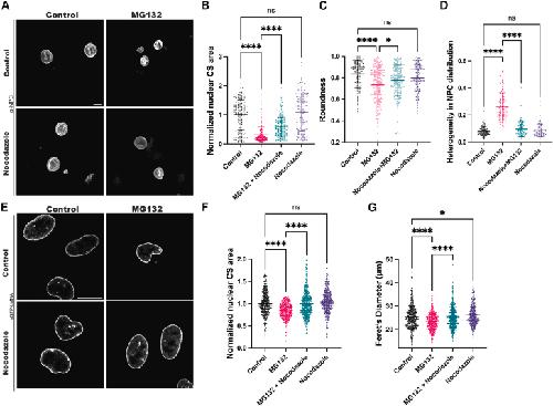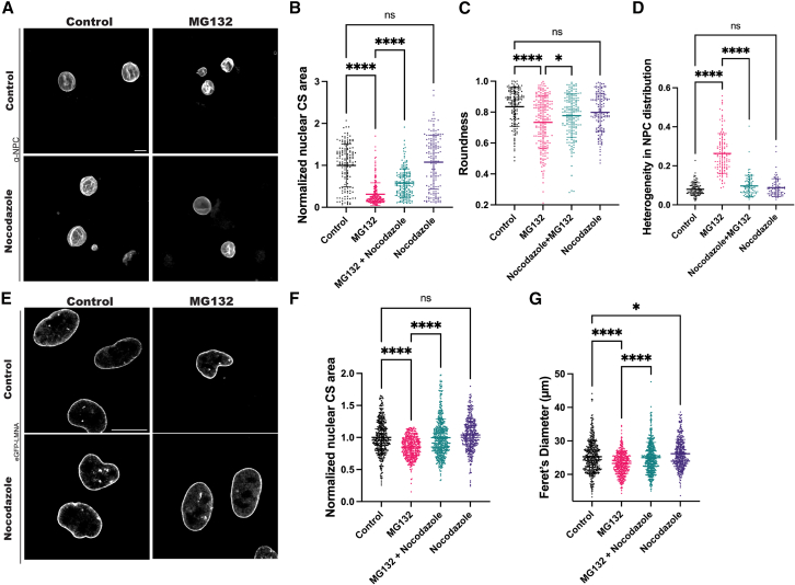 Figure 2. Microtubules contribute to the altered nuclear morphology induced by MG132(A–D) Nuclei were assembled in Xenopus laevis egg extract. After nuclear assembly, extracts were supplemented with 500 μM MG132 and/or 33 μM nocodazole, as indicated. After a 45-min treatment, nuclei were fixed and immunofluorescence against the NPC was performed with mAb414. (A) Representative widefield images are shown. The scale bar is 20 μm.(B–C) Nuclear CS area and roundness were quantified as in Figure 1.(D) Heterogeneity in NPC distribution, which reflects the wrinkled appearance of the nuclear envelope, was quantified by drawing line scans within the nuclear interior and calculating the standard deviation of the NPC signal intensity along the line. Nuclear CS area, roundness, and heterogeneity in NPC distribution were quantified for >100 nuclei per condition and three biological replicates.(E–G) eGFP-LMNA HeLa cells were treated with 200 μM MG132 and/or 3 μM nocodazole for 1 h and fixed. (E) Representative confocal images are shown. The scale bar is 20 μm.(F–G) Nuclear CS area and Feret’s diameter were quantified as in Figure 1 for >100 nuclei per condition and three biological replicates. Error bars represent SD. Ordinary One-Way ANOVA: ns, not significant; ∗p < 0.05; ∗∗∗∗p < 0.0001.