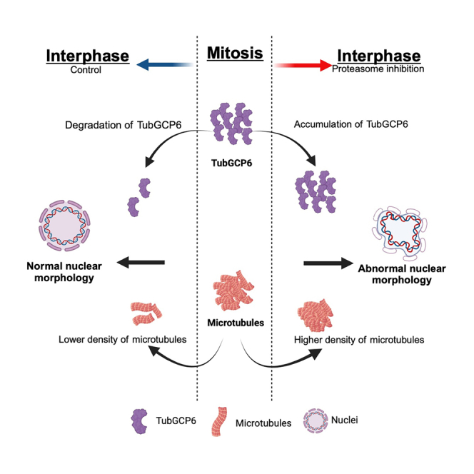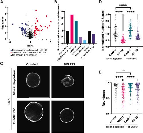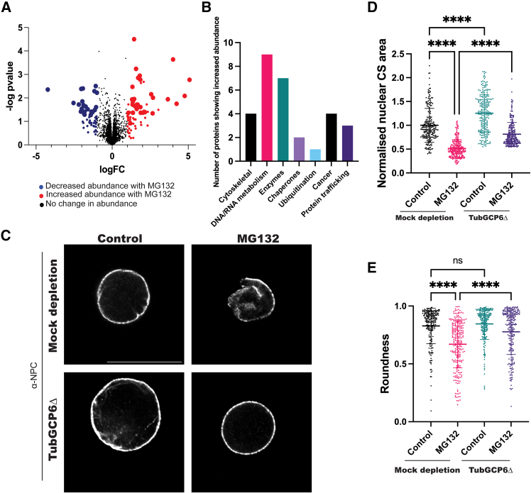 Figure 4. Altered nuclear morphology in MG132-treated Xenopus egg extract is partially mediated by TubGCP6(A and B) Mass spectrometry-based DIA analysis was performed on five biological replicates of control untreated interphase X. laevis egg extracts and extracts treated with 500 μM MG132 for 45 min. The relative concentrations of ∼7000 proteins were determined in Control versus MG132-treated extracts. For determining differences between the two conditions, the false discovery threshold was set at 1%, and proteins with an FDR adjusted p-value <0.05 and fold change >2 were considered significant. (A) Volcano plot of proteins that showed increased abundance (red dots) and decreased abundance (blue dots) upon MG132 treatment as compared to controls. Peptides with a greater than 2-fold increase or decrease in abundance and FDR adjusted p-value <0.05 are indicated with bigger circles. Black dots indicate proteins without any significant change in abundance. (B) 30 proteins with known functions showed a greater than 2-fold increase in abundance in MG132-treated extracts with FDR adjusted p-value of <0.05.(C–E) X. laevis egg extracts were immunodepleted using antibodies against TubGCP6 (TubGCP6Δ) or mock depleted as a control. Nuclei were assembled in immunodepleted extracts, then extracts were supplemented with 500 μM MG132 or an equivalent volume of buffer (Control). After a 45-min incubation, nuclei were fixed and immunofluorescence against the NPC was performed with mAb414. (C) Representative confocal images are shown. The scale bar is 20 μm.(D) Nuclear CS area was quantified as in Figure 1.(E) Nuclear roundness was quantified as in Figure 1. Nuclear CS area and roundness were quantified for >100 nuclei per condition and three biological replicates. Error bars represent SD. Ordinary One-Way ANOVA: ns, not significant; ∗∗∗∗p < 0.0001. See also Figure S3 and Tables S1 and S2.