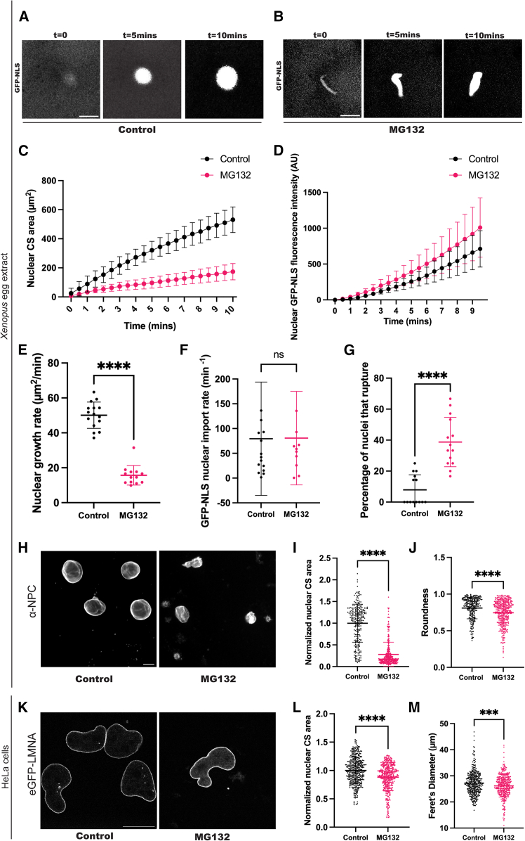 Figure 1. Proteasome inhibitor MG132 affects nuclear morphology and integrity(A–G) Xenopus laevis egg extract was supplemented with 500 μM MG132 or an equivalent volume of buffer (Control). We tested a range of MG132 concentrations and selected 500 μM because it induced the greatest effect on nuclear morphology (Figure S4). GFP-NLS was added at 0.4 μg/μL for imaging, nuclear assembly was initiated as described in STAR Methods, and live widefield imaging was performed for 1 h at 30 s intervals. Once import-competent nuclei formed, quantification was performed for the subsequent 10 min to interrogate initial nuclear growth and import rates immediately after nuclear assembly. Data were acquired for 15 nuclei per condition and three biological replicates. (A-B) Images from representative time-lapses are shown. The scale bar is 20 μm. (C) At the indicated time points, nuclei were thresholded based on GFP-NLS signal and nuclear cross-sectional (CS) area was quantified and plotted as a function of time. (D) At the indicated time points, nuclei were thresholded and total nuclear GFP-NLS fluorescence intensity was quantified by multiplying average GFP-NLS pixel intensity by nuclear volume to obtain the integrated volumetric nuclear GFP-NLS signal (see STAR Methods). These data were plotted as a function of time. (E) Nuclear growth rates were quantified based on the data shown in (C) by calculating the slope of the graph. (F) Nuclear import rates were quantified based on the data shown in (D) by calculating the slope of the graph. (G) When nuclei rupture, the intranuclear GFP-NLS signal disperses. To quantify the number of ruptured nuclei, we counted the number of nuclei positive for intranuclear GFP-NLS at the start of imaging and subtracted the number of nuclei still positive for intranuclear GFP-NLS after 1 h. This number was divided by the initial number of nuclei to obtain the rupture frequency. Ruptures typically occurred after the 10-min window used to calculate nuclear growth and import rates.(H–J) Nuclei were assembled in Xenopus laevis egg extract. After nuclear assembly, extracts were supplemented with 500 μM MG132 or an equivalent volume of buffer (Control) and incubated for 45 min. Nuclei were fixed and immunofluorescence against the nuclear pore complex (NPC) was performed with mAb414. (H) Representative widefield images are shown. The scale bar is 20 μm. (I) After thresholding, nuclear CS area was quantified and normalized to controls. (J) Thresholded images were quantified for nuclear roundness, which is the ratio of CS area to the square of the major axis. Nuclear CS area and roundness were quantified for >100 nuclei per condition and three biological replicates.(K–M) eGFP-LMNA HeLa cells were treated with 200 μM MG132 or an equivalent volume of buffer (Control) for 1 h and fixed. (K) Representative confocal images are shown. The scale bar is 20 μm.(L) After thresholding, nuclear CS area was quantified and normalized to controls. (M) Feret’s diameter, which is a measure of the longest distance between two points in a selected boundary, was calculated from thresholded images and used as a metric to quantify nuclear shape in HeLa cells. Nuclear CS area and Feret’s diameter were quantified for >100 nuclei per condition and three biological replicates. Error bars represent SD, except for in (D) where error bars are SEM. Unpaired two-tailed t-tests: ns, not significant; ∗∗∗p < 0.001; ∗∗∗∗p < 0.0001. See also Figure S1 and Video S1.