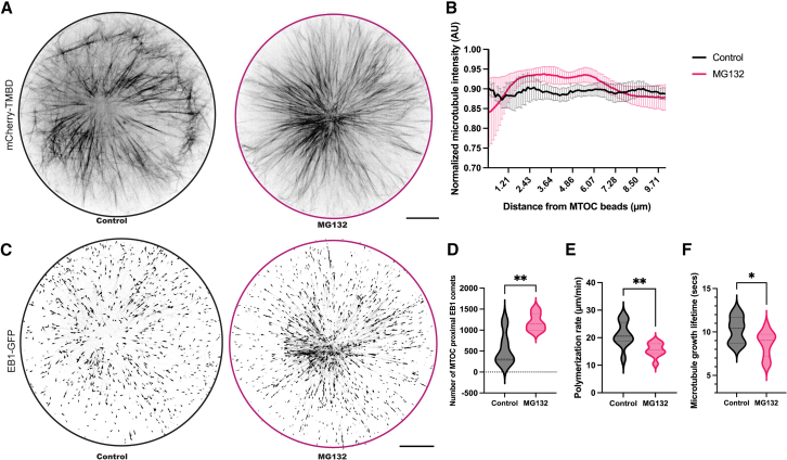 Figure 3. MG132-treatment affects interphase microtubule architecture and dynamicsInterphase X. laevis egg extract supplemented with mCherry-TMBD (to label microtubules) and EB1-GFP (to label microtubule plus ends) was encapsulated in 110 μm diameter cylindrical hydrogel enclosures containing an aMTOC. Where indicated, extracts were treated with 500 μM MG132. Time-lapse confocal imaging was performed near the coverslip at 5-s intervals for visualizing microtubules with mCherry-TMBD and at 0.5-s intervals for visualizing microtubule plus ends with EB1-GFP. aMTOC-nucleated microtubules cause the aMTOC to center within the hydrogel chamber, reaching a steady-state architecture within 10 min. (A) Representative inverted images of interphase microtubule asters. Average intensity projections of consecutive confocal images acquired over 100 s are shown. The black and purple circles represent the inner edges of the enclosures. The scale bar is 20 μm.(B) Normalized mean microtubule intensity distributions were quantified along 10 μm radial lines extending from the aster center toward the enclosure periphery (see STAR Methods). Error bars represent SEM.(C) Representative inverted images of interphase microtubule plus ends labeled with EB1-GFP after aster centration. Single time point images were randomly selected from time-lapses. The black and purple circles represent the inner edges of the enclosures. The scale bar is 20 μm.(D) The number of EB1 comets was quantified within a 10 μm radial zone around the aster center over 1 min.(E) The microtubule plus end polymerization rate and (F) microtubule growth lifetime were quantified within the entire enclosure using uTrack. See STAR Methods for quantification details. Data are presented as violin plots. Data are from at least three independent experiments using at least three different extract preparations. Unpaired two-tailed t-tests: ∗p < 0.05; ∗∗p < 0.005. See also Figure S2 and Videos S2, and S3.