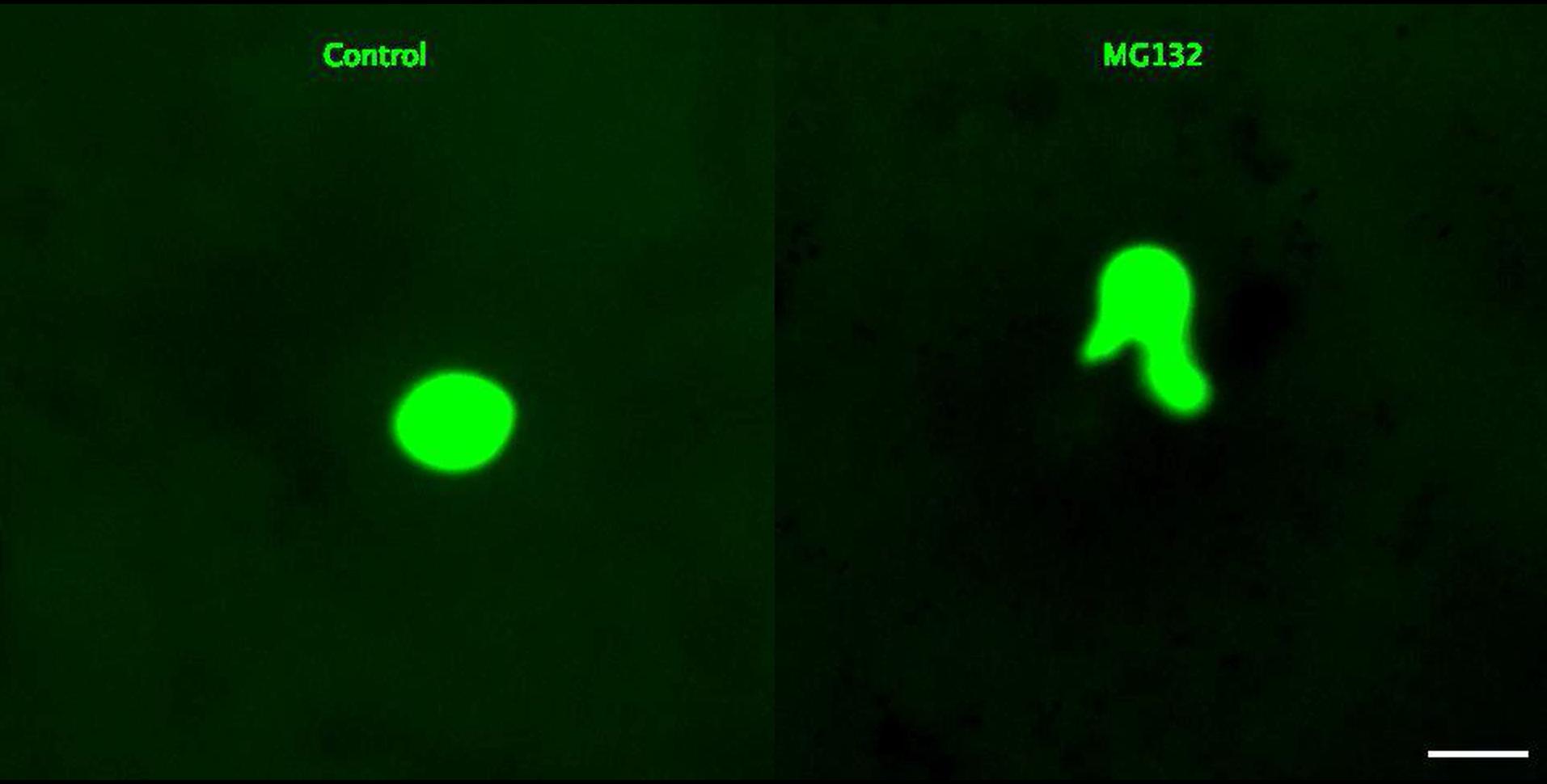 Video S1. Proteasome inhibitor MG132 affects nuclear integrity, related to Figure 1. X. laevis egg extract was supplemented with 500 μM MG132 or an equivalent volume of buffer (Control). Nuclear assembly was initiated by the addition of calcium, cycloheximide, energy mix, and demembranated sperm chromatin (see STAR Methods). GFP-NLS was added at 0.4 μg/μL to visualize nuclei. Live widefield imaging of nuclear growth was performed. Images were acquired every 3 min, and the presented time-lapse is 55 min long. Approximately 41 min into the time-lapse, nuclear rupture occurs in the MG132-treated extract as evidenced by loss of nuclear GFP-NLS signal (right panel). The control nucleus remains intact (left panel). The scale bar is 20 μm