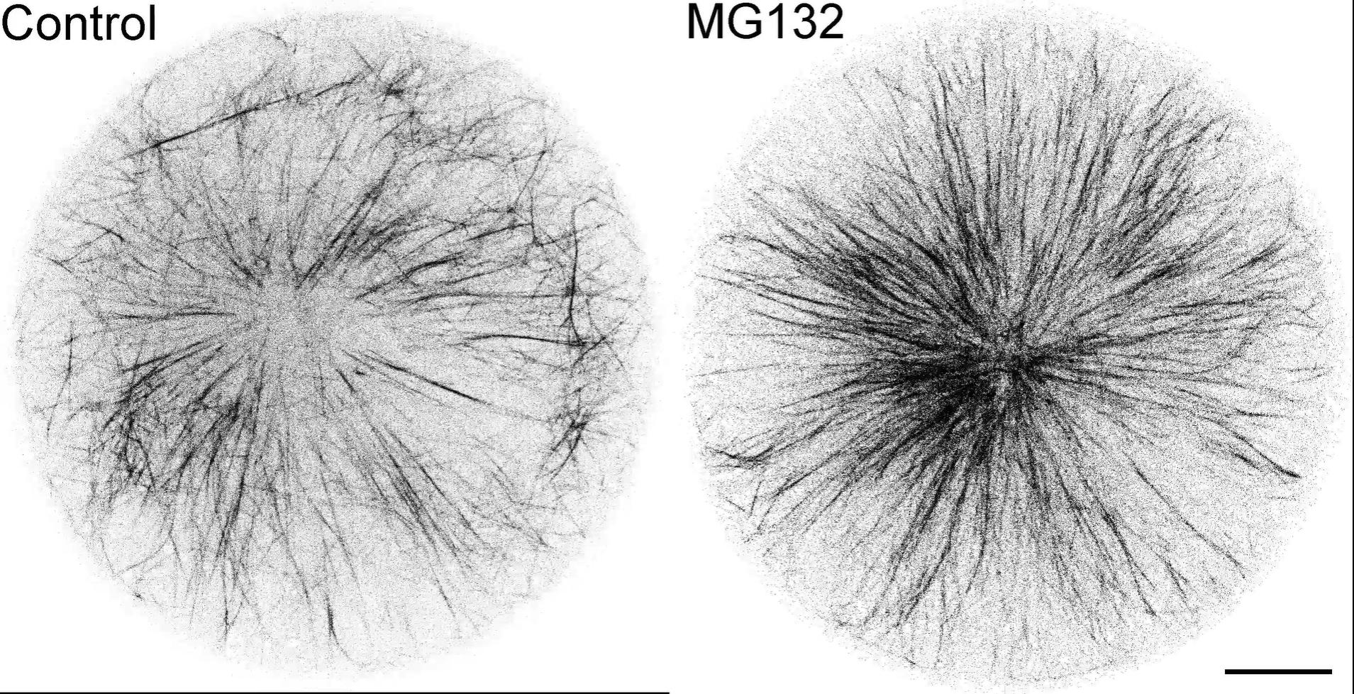 Video S2. Proteasome inhibitor MG132 affects interphase astral microtubule architecture in hydrogel enclosures, related to Figure 3. X. laevis egg extract was transitioned to interphase by adding calcium and cycloheximide. Where indicated extracts were treated with 500 μM MG132. The extracts were encapsulated in cylindrical hydrogel enclosures of 110 μm diameter, and mCherry-TMBD was included to visualize microtubules. Time-lapse confocal imaging was performed near the coverslip at 5-s intervals. aMTOC-nucleated microtubules cause the aMTOC to center within the hydrogel chamber, reaching steady state within 10 min. Microtubules were imaged to compare the microtubule architecture between Control (left) and MG132-treated extracts (right). The presented time-lapse covers 2.5 min at a playback speed of 5 frames per second. Scale bar, 20 μm