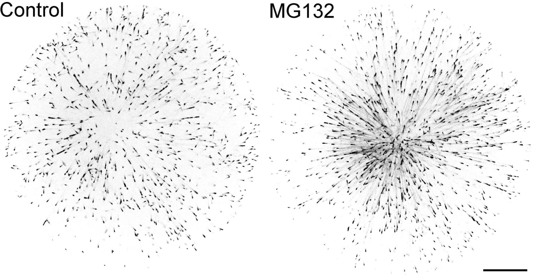 Video S3. Proteasome inhibitor MG132 alters the spatial distribution and dynamics of growing microtubule plus ends in interphase asters, related to Figure 3. X. laevis egg extract was transitioned to interphase by adding calcium and cycloheximide. Where indicated extracts were treated with 500 μM MG132. These extracts were encapsulated within cylindrical hydrogel enclosures of 110 μm diameter, and EB1-GFP was added to visualize the growing plus ends of microtubules. Time-lapse confocal imaging was performed near the coverslip at 0.5-s intervals. aMTOC-nucleated microtubules cause the aMTOC to center within the hydrogel chamber, reaching steady state within 10 min. EB1-GFP imaging was conducted to compare the distribution and growth dynamics of growing microtubule plus ends near the aster center in Control (left) and MG132-treated extracts (right). The presented time-lapse covers 1 min at a playback speed of 10 frames per second. Scale bar, 20 μm