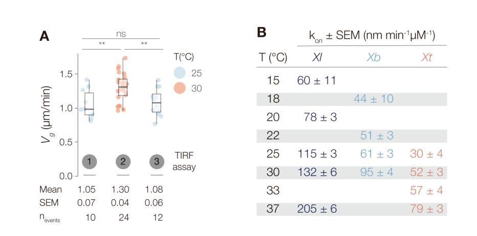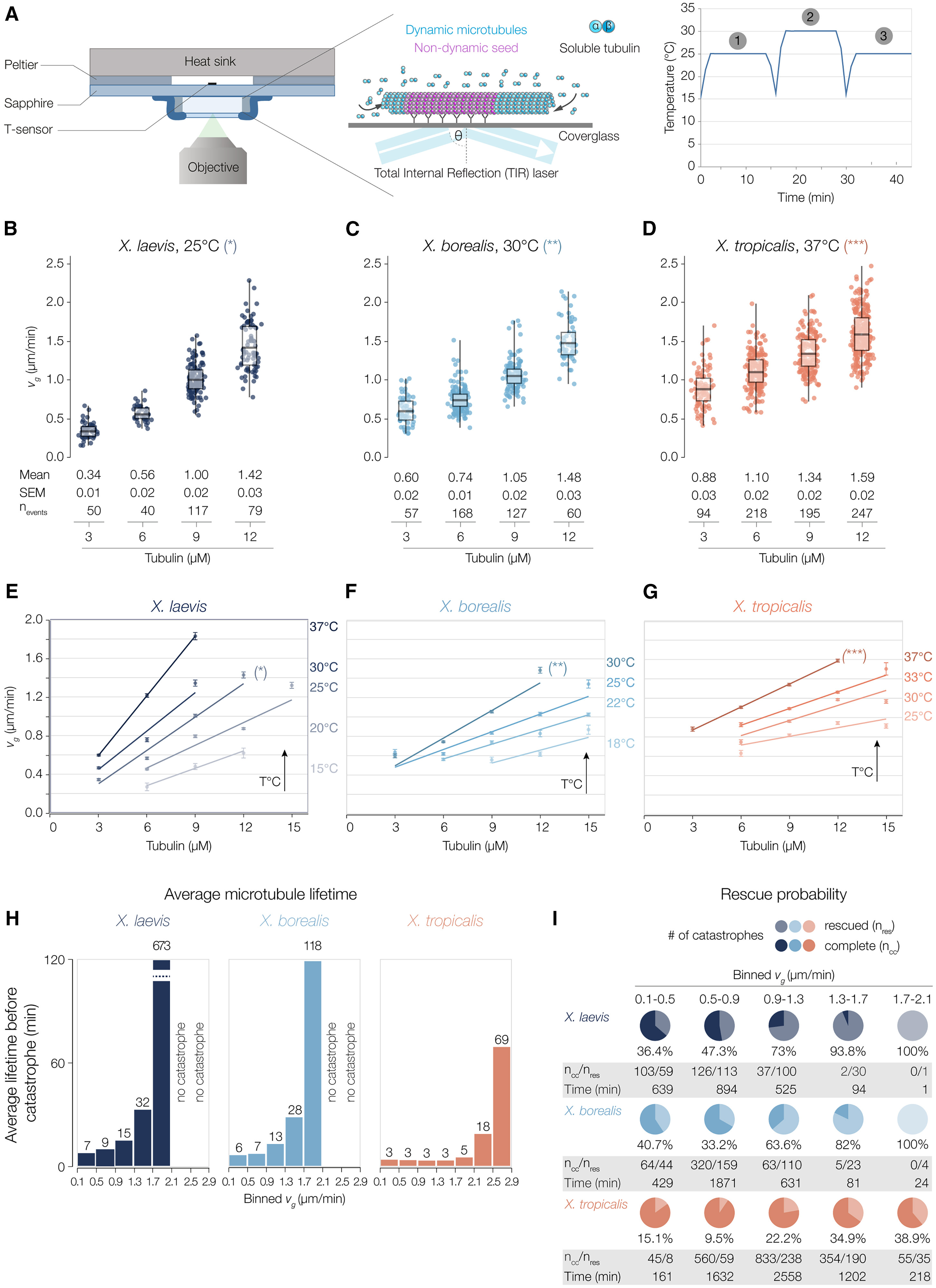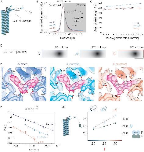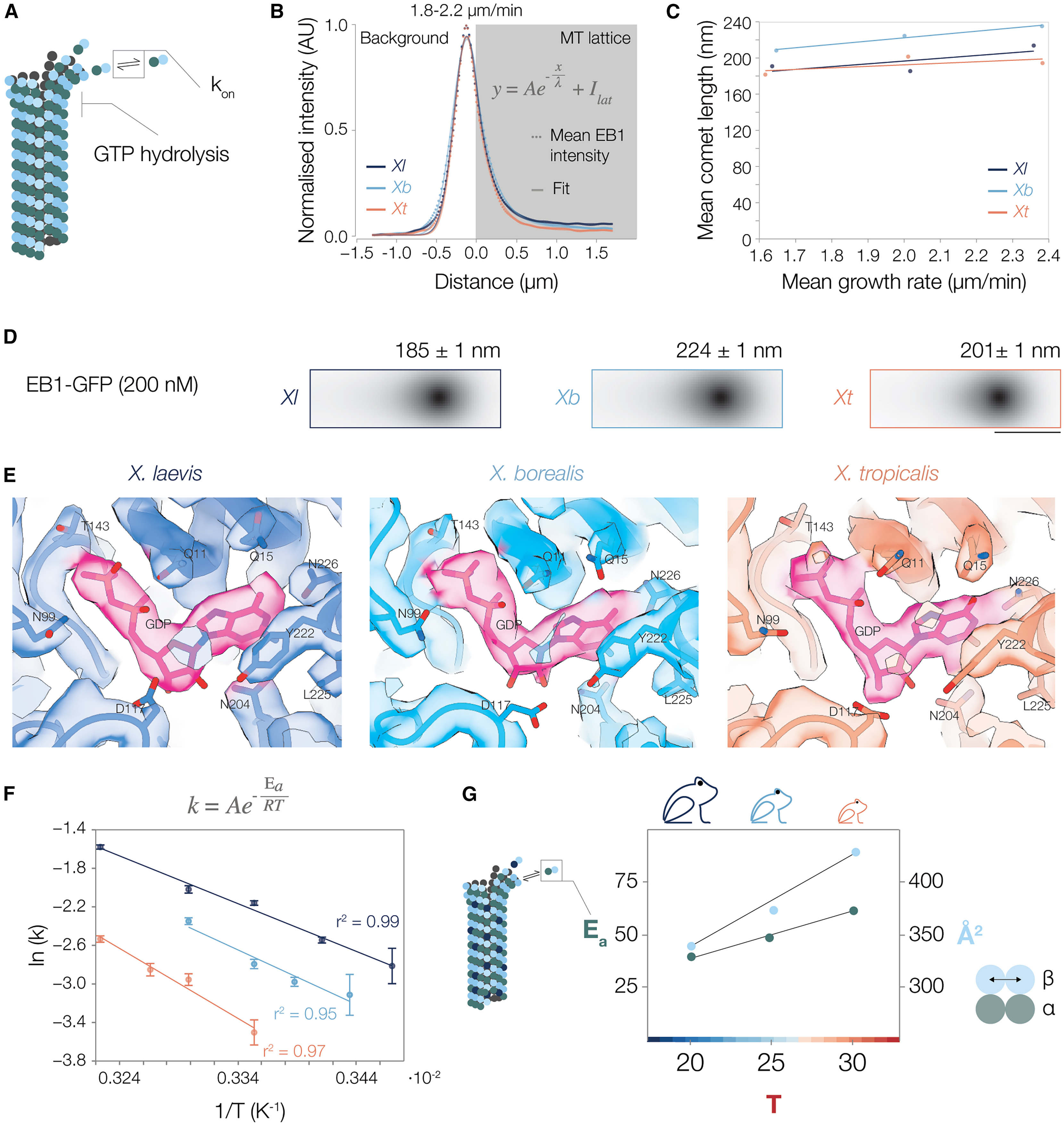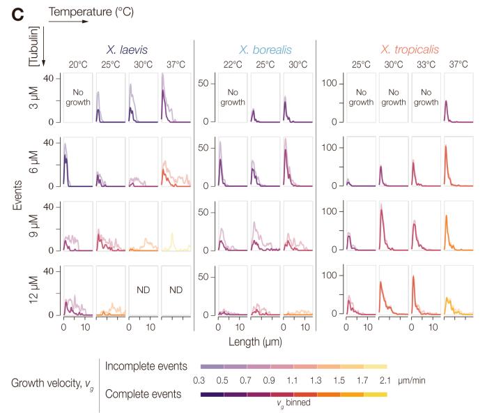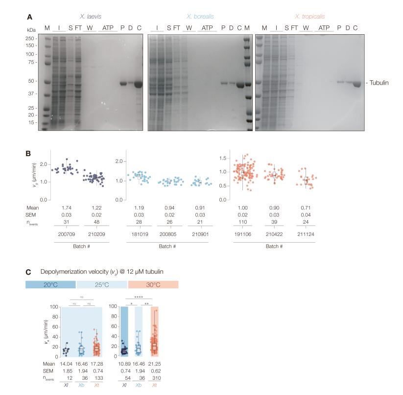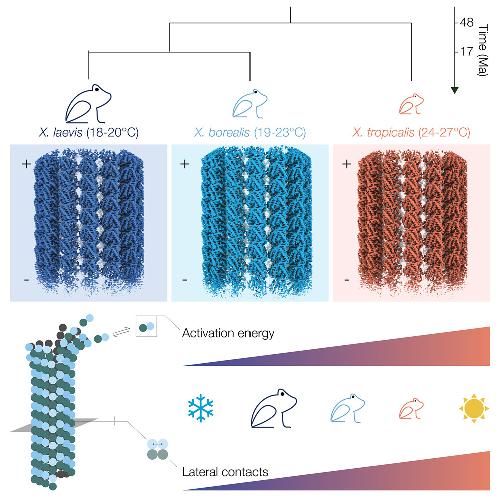 Mechanistic basis of temperature adaptation in microtubule dynamics across frog species.
