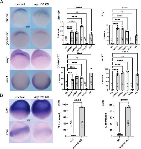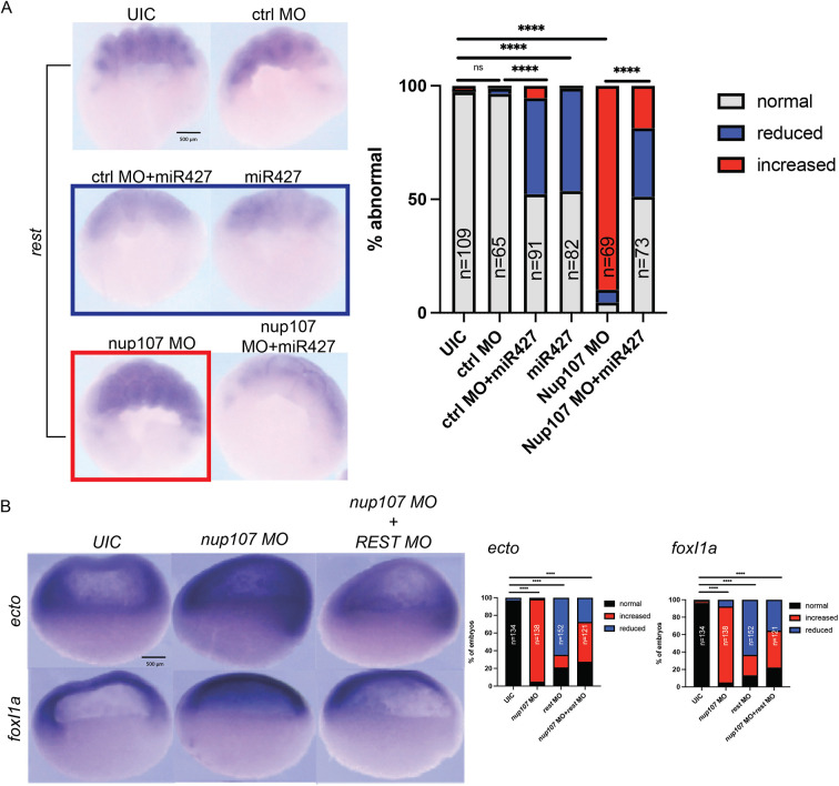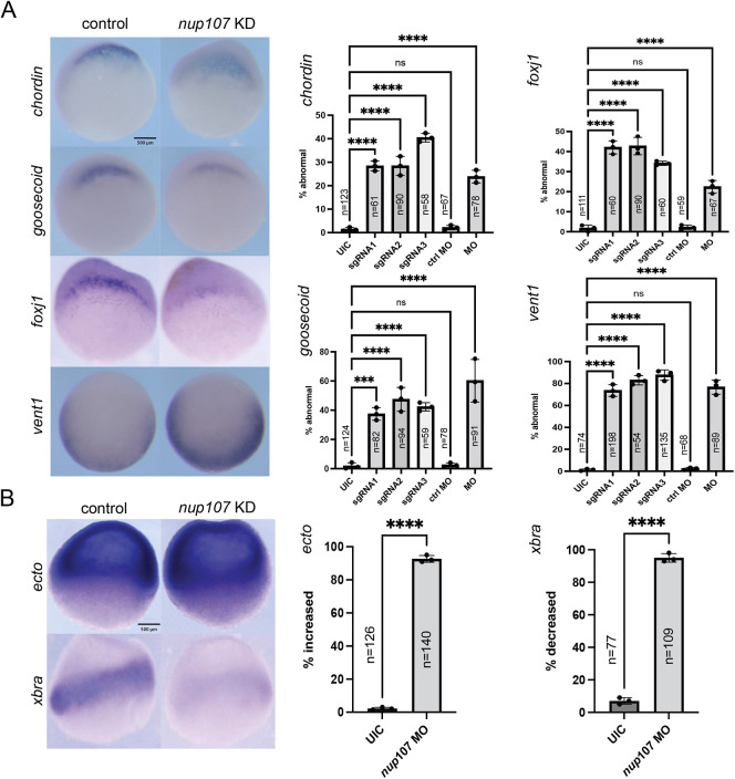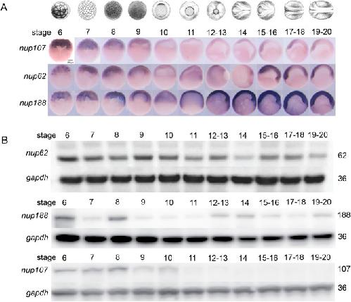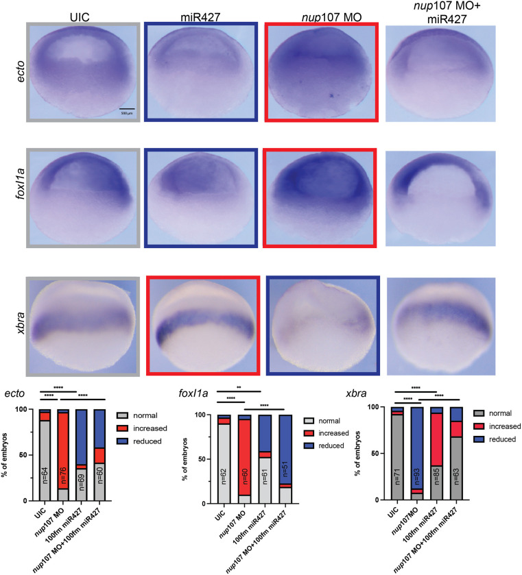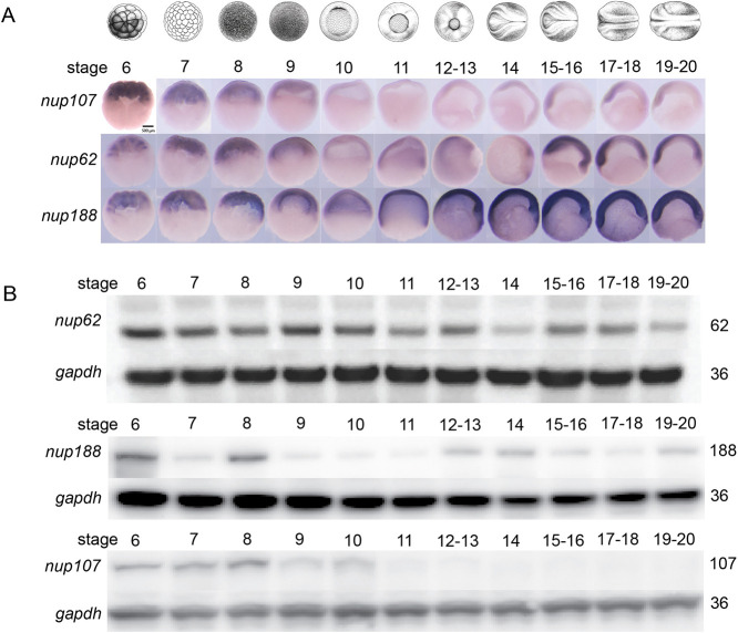 Emerging evidence suggests that the nuclear pore complex can have unique compositions and distinct nucleoporin functions in different cells. Here, we show that Nup107, a key component of the NPC scaffold, varies in expression over development: it is expressed at higher levels in the blastula compared to the gastrula, suggesting a crucial role before gastrulation in Xenopus. We find that depletion of Nup107 affects the differentiation of the early germ layers leading to an expansion of the ectoderm at the expense of endoderm and mesoderm. By analyzing an RNA-sequencing time course, we observed that depletion of Nup107 affects the maternal-zygotic transition by delaying the degradation of maternal transcripts that occurs as zygotic transcription begins. The transcripts are enriched in recognition sites for miR427, a conserved microRNA that destabilizes maternal transcripts including REST, which encodes a Kruppel-type zinc-finger transcription factor that we demonstrate is crucial for ectodermal cell fates. Mechanistically, we show that Nup107 is required to prevent the premature export of pri-miR427 transcript before processing. Nup107 depletion leads to the reduced production of mature miR427 and maternal transcript stabilization. We conclude that high levels of Nup107 in the early embryo are crucial for the nuclear retention and subsequent processing of pri-miR427 transcripts that is required for timely maternal RNA clearance to enable gastrulation.