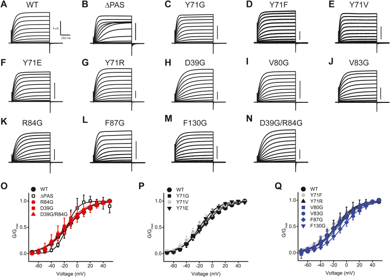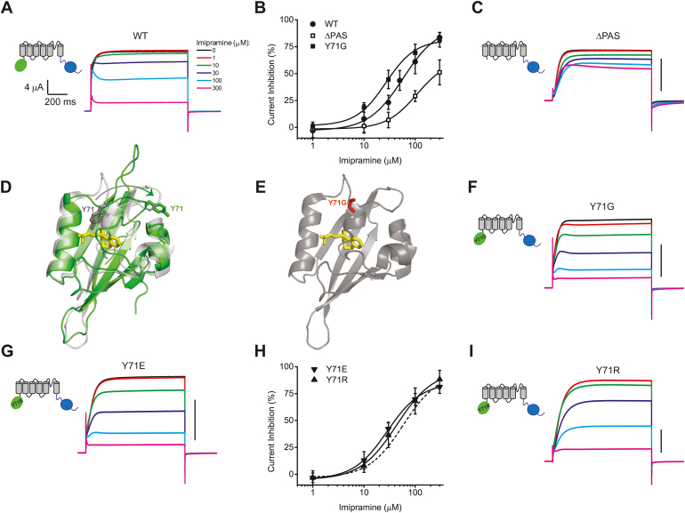 Ether-a-go-go (EAG) channels are key regulators of neuronal excitability and tumorigenesis. EAG channels contain an N-terminal Per-Arnt-Sim (PAS) domain that can regulate currents from EAG channels by binding small molecules. The molecular mechanism of this regulation is not clear. Using surface plasmon resonance and electrophysiology we show that a small molecule ligand imipramine can bind to the PAS domain of EAG1 channels and inhibit EAG1 currents via this binding. We further used a combination of molecular dynamics (MD) simulations, electrophysiology, and mutagenesis to investigate the molecular mechanism of EAG1 current inhibition by imipramine binding to the PAS domain. We found that Tyr71, located at the entrance to the PAS domain cavity, serves as a "gatekeeper" limiting access of imipramine to the cavity. MD simulations indicate that the hydrophobic electrostatic profile of the cavity facilitates imipramine binding and in silico mutations of hydrophobic cavity-lining residues to negatively charged glutamates decreased imipramine binding. Probing the PAS domain cavity-lining residues with site-directed mutagenesis, guided by MD simulations, identified D39 and R84 as residues essential for the EAG1 channel inhibition by imipramine binding to the PAS domain. Taken together, our study identified specific residues in the PAS domain that could increase or decrease EAG1 current inhibition by imipramine binding to the PAS domain. These findings should further the understanding of molecular mechanisms of EAG1 channel regulation by ligands and facilitate the development of therapeutic agents targeting these channels.