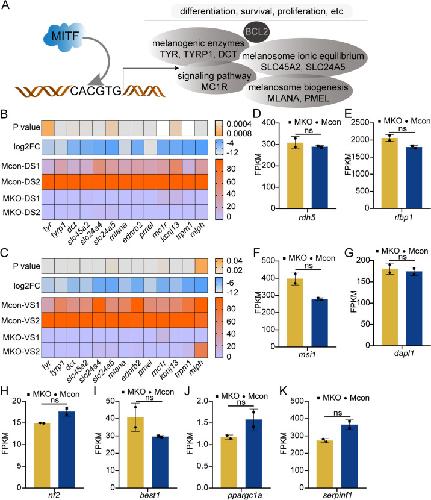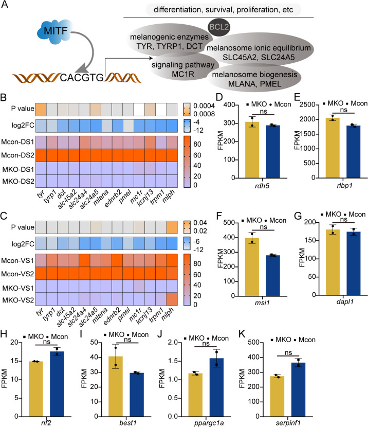 Fig. 2. Xenopus tropicalis Mitf regulates the expression of genes related to melanocyte development. A The cartoon provides a schematic representation of how the human MITF protein regulates the expression of target genes via the M-box (CACGTG), thereby controlling melanocyte development. B, C Heat maps show the differential expression of genes associated with melanocyte development in the dorsal (B) and ventral (C) skin of WT and mitf−/− Xenopus tropicalis. The FPKM values for each gene were normalized using the normalization function in GraphPad Prism 8.0 software, which was also used to create the heat maps. Mcon-DS1, Mcon-DS2, MKO-DS1, and MKO-DS2 represent two replicates of dorsal skin from WT and mitf−/− Xenopus tropicalis, respectively. Similarly, Mcon-VS1, Mcon-VS2, MKO-VS1, and MKO-VS2 represent two replicates of ventral skin from WT and mitf−/− Xenopus tropicalis, respectively. Each replicate sample from wild-type and mitf−/− Xenopus tropicalis was obtained from the dorsal or ventral skin of three frogs. D–K The expression of Mitf-activated target genes (rdh5, rlbp1, msi1, dapl1, nf2, best1, ppargc1a, serpinf1) in the eyes of WT and mitf−/− Xenopus tropicalis (unpaired t test) |