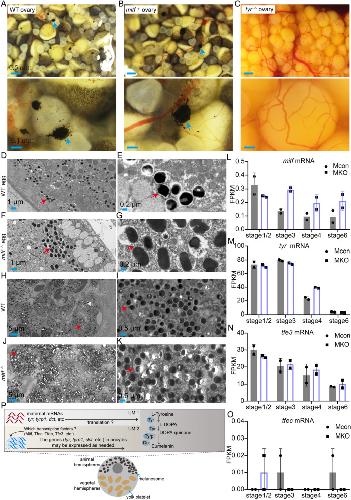 Fig. 3. Tyr regulates melanin deposition in Xenopus tropicalis oocytes. A–C Representative images show the ovarian from 1-year-old WT, mitf−/−, and tyr−/− female Xenopus tropicalis, with three frogs observed for each genotype (n = 9 frogs). In A and B, magnified views of black spots on the ovarian peritoneum, indicated by blue arrows in the upper panels, are shown in the corresponding lower panels and are also indicated by blue arrows. The scale bars in the upper panels of A, B, and C are 0.5 mm, and in the lower panels, they are 0.1 mm. D, F Figures present TEM images of oocytes from one-year-old WT and mitf−/− Xenopus tropicalis. E and G are enlarged views of the regions indicated by red arrows in D and F, respectively. H, J Figures display TEM images of black spots on the ovarian peritoneum of 1-year-old WT and mitf−/− Xenopus tropicalis. I and K are enlarged views of the regions indicated by red arrows in H and J, respectively. The scale bars are as shown in the images. All images in D–K are representative (n = 3 frogs). L–O Figures show the mRNA expression levels of mitf, tyr, tfe3, and tfec during oocyte development in WT and mitf−/− Xenopus tropicalis, presented as FPKM values. P The cartoon provides a schematic diagram summarizing the possible molecular mechanisms regulating melanin deposition in Xenopus tropicalis oocytes. For the P values of the data in L–O, please refer to Supplementary Table S3. The statistical tests are the Wald test and the Likelihood ratio test in Deseq2 |