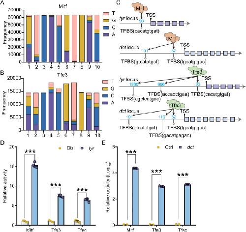 Fig. 4. MiT family transcription factors Tfe3, Mitf, and Tfec regulate the expression of the tyr and dct genes. A–B show the nucleotide frequency of different bases at various positions within the DNA binding motifs for Mitf and Tfe3. Data were obtained from JASPAR. C The DNA binding motifs for Mitf and Tfe3 in the promoter region of tyr and dct (2000 bp upstream of the transcription start site, TSS). The blue numbers indicate the distance (in base pairs) from the TSS. Data were obtained from JASPAR and NCBI. D–E Present dual-luciferase assay results for the regulation of tyr and dct expression by Mitf, Tfe3, and Tfec (n = 4). *** indicates a P value < 0.001, as determined by an unpaired t test |