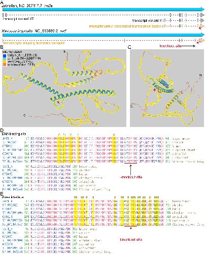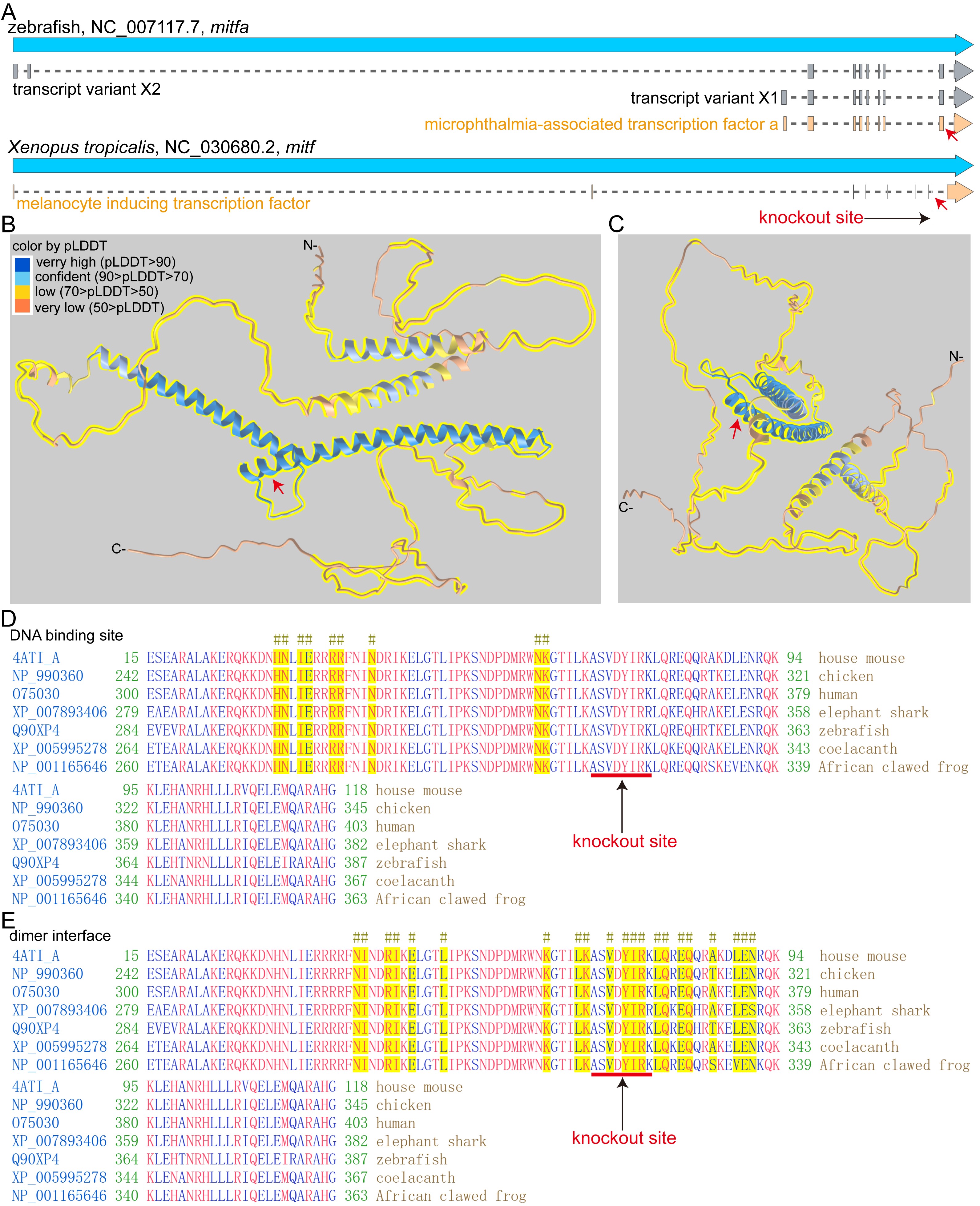 Supplementary Figure S2. In mitf-/- Xenopus tropicalis, the bHLHzip domain of the Mitf protein, is inactivated. A, the picture provides a schematic representation of the transcripts and related information of the mitfa gene locus in zebrafish and the mitf gene locus in Xenopus tropicalis. The red arrow indicates the penultimate exon, which is responsible for transcribing a common part of the transcripts from this gene locus. B and C, pictures display two different views of the 3D structure of the human MITF protein (encoded by transcript variant 4 of the human MITF gene locus, a master regulator of melanocyte development). The yellow-highlighted regions show the conserved amino acid sequences between the Xenopus tropicalis Mitf protein and the human MITF protein. The red arrow points to the knockout site in the mitf-/- Xenopus tropicalis Mitf protein. 'N' indicates the amino-terminal, and 'C' indicates the carboxy-terminal. D and E, the figure illustrate the amino acid sequence alignment of feature 1 (DNA binding site) and feature 2 (polypeptide binding site/dimer interface) of the bHLHzip domain among different vertebrate species. In D and E, red indicates high conservation and blue indicates low conservation. Hash-marks (#) in the top row of the multiple sequence alignment display indicate specific residues involved in a conserved feature, such as a binding or catalytic site, that has been annotated on an NCBI-curated domain. The black arrows in A, D, and E indicate the knockout site of mitf-/- Xenopus tropicalis mitf. For detailed data analysis, refer to NCBI (https://www.ncbi.nlm.nih.gov/) |