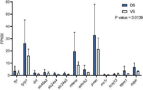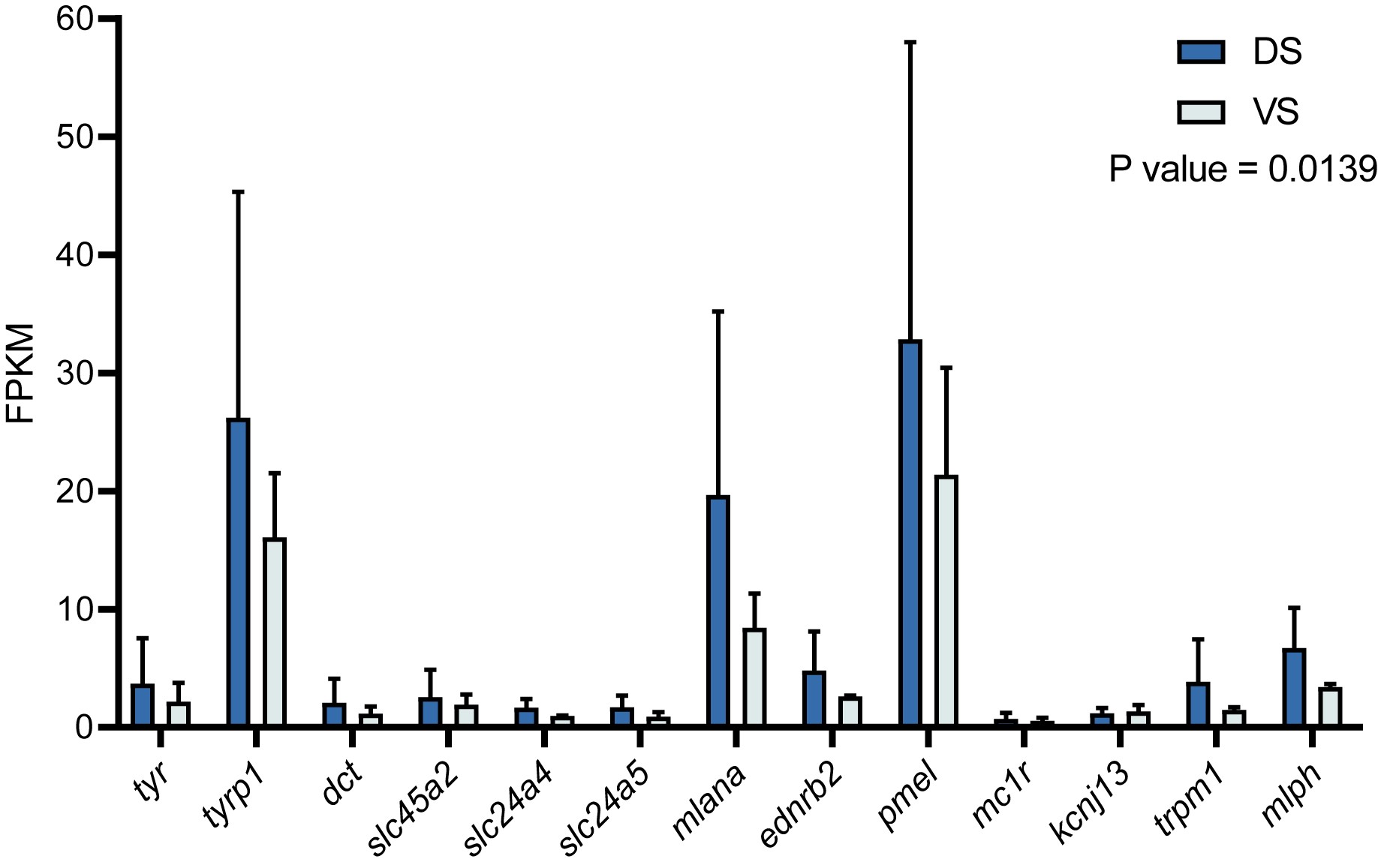 Supplementary Figure S3. The transcriptomic comparison of dorsal (DS) and ventral (VS) skin samples from wild-type Xenopus tropicalis revealed significant overall differences in the expression of melanogenesis-related genes (P = 0.0139, paired t-test). |