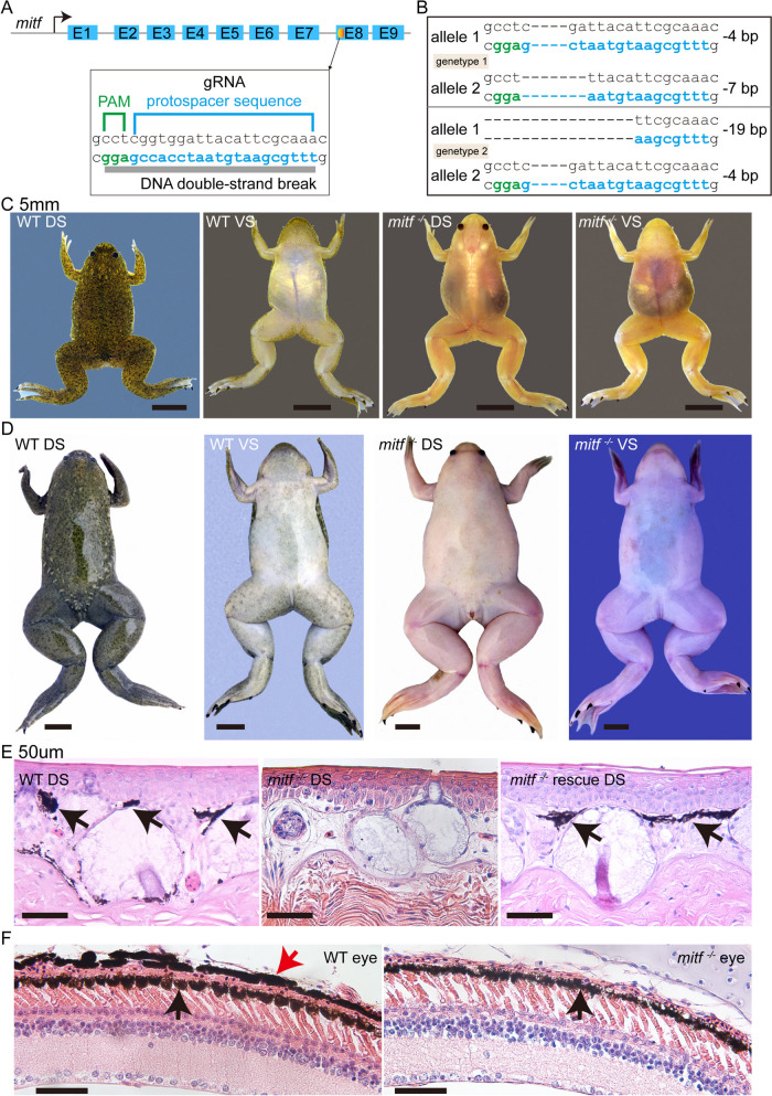 Fig. 1. The mitf−/−Xenopus tropicalis. A The knockout site of mitf in Xenopus tropicalis. B The genotype of mitf−/− Xenopus tropicalis (n = 40 tadpoles). C Dorsal and ventral views of representative wild-type (WT) and mitf−/− Xenopus tropicalis (WT, n = 10 froglets; mitf−/−, n = 10 froglets). D Dorsal and ventral views of representative WT and mitf−/− Xenopus tropicalis at 1 year old (WT, n = 10 frogs; mitf−/−, n = 10 frogs). E Hematoxylin and eosin staining of representative dorsal skin tissue sections from WT, mitf−/−, and mitf−/− rescue (G0 generation after gene knockout site repair) Xenopus tropicalis. Three frogs of each genotype were examined. Tissue samples were embedded in paraffin and sectioned at 6 μm thickness, with at least 10 paraffin sections observed per frog. Black arrows indicate melanocytes. F Hematoxylin and eosin staining of representative eye tissue sections from WT and mitf−/− Xenopus tropicalis. Three frogs of each genotype were examined. Tissue samples were embedded in paraffin and sectioned at 6 μm thickness, with at least 10 paraffin sections observed per frog. Black arrows indicate the RPE, and red arrows indicate melanocytes in the choroid layer. DS, dorsal view; VS, ventral view. Scale bars: 5 mm in C and D, 50 μm in E and F |