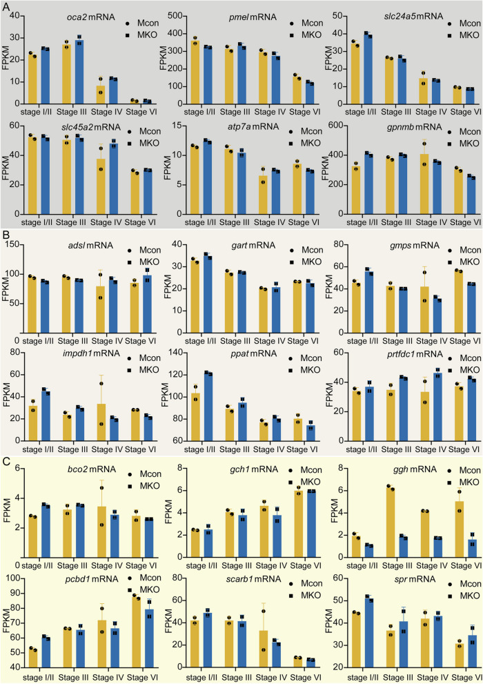 Fig. 5. The expression of key genes involved in pigment synthesis progressively decreases during oocyte development in Xenopus tropicalis. A During oocyte development in WT and mitf−/− Xenopus tropicalis, the mRNA expression levels of genes associated with melanin synthesis pathways are shown as FPKM values. B, C During oocyte development in WT and mitf−/− Xenopus tropicalis, the mRNA expression levels of genes associated with carotenoid and pteridine synthesis pathways are shown as FPKM values. For the P values of the data in figures, please refer to Additional file 2: Table S3. The statistical tests are the Wald test and the Likelihood ratio test in Deseq2 |