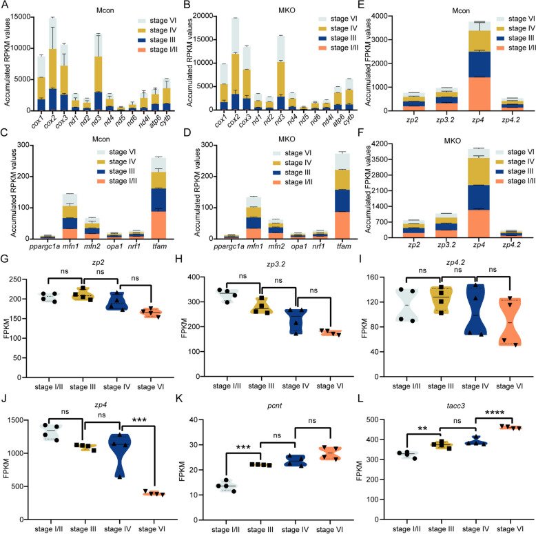 Fig. 6. Differentially expressed genes during oogenesis development in Xenopus tropicalis. A Expression of mitochondria-related genes during oogenesis in WT Xenopus tropicalis. B Expression of mitochondria-related genes during oogenesis in mitf−/− Xenopus tropicalis. C Expression of key genes regulating mitochondrial biogenesis during oogenesis in WT Xenopus tropicalis. D Expression of key genes regulating mitochondrial biogenesis during oogenesis in mitf−/− Xenopus tropicalis. E Expression of zona pellucida formation-related genes during oogenesis in WT Xenopus tropicalis. F Expression of zona pellucida formation-related genes during oogenesis in mitf−/− Xenopus tropicalis. G–J Average expression of zona pellucida formation-related genes zp2, zp3.2, zp4.2, and zp4 during oogenesis in WT and mitf−/− Xenopus tropicalis. K–L Average expression of meiosis-related genes pcnt and tacc3 during oogenesis in WT and mitf−/− Xenopus tropicalis. Results are shown as FPKM values. For A–F, the statistical tests are the Wald test and the Likelihood ratio test in Deseq2. For G–L, the statistical tests are the one-way ANOVA |