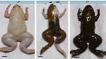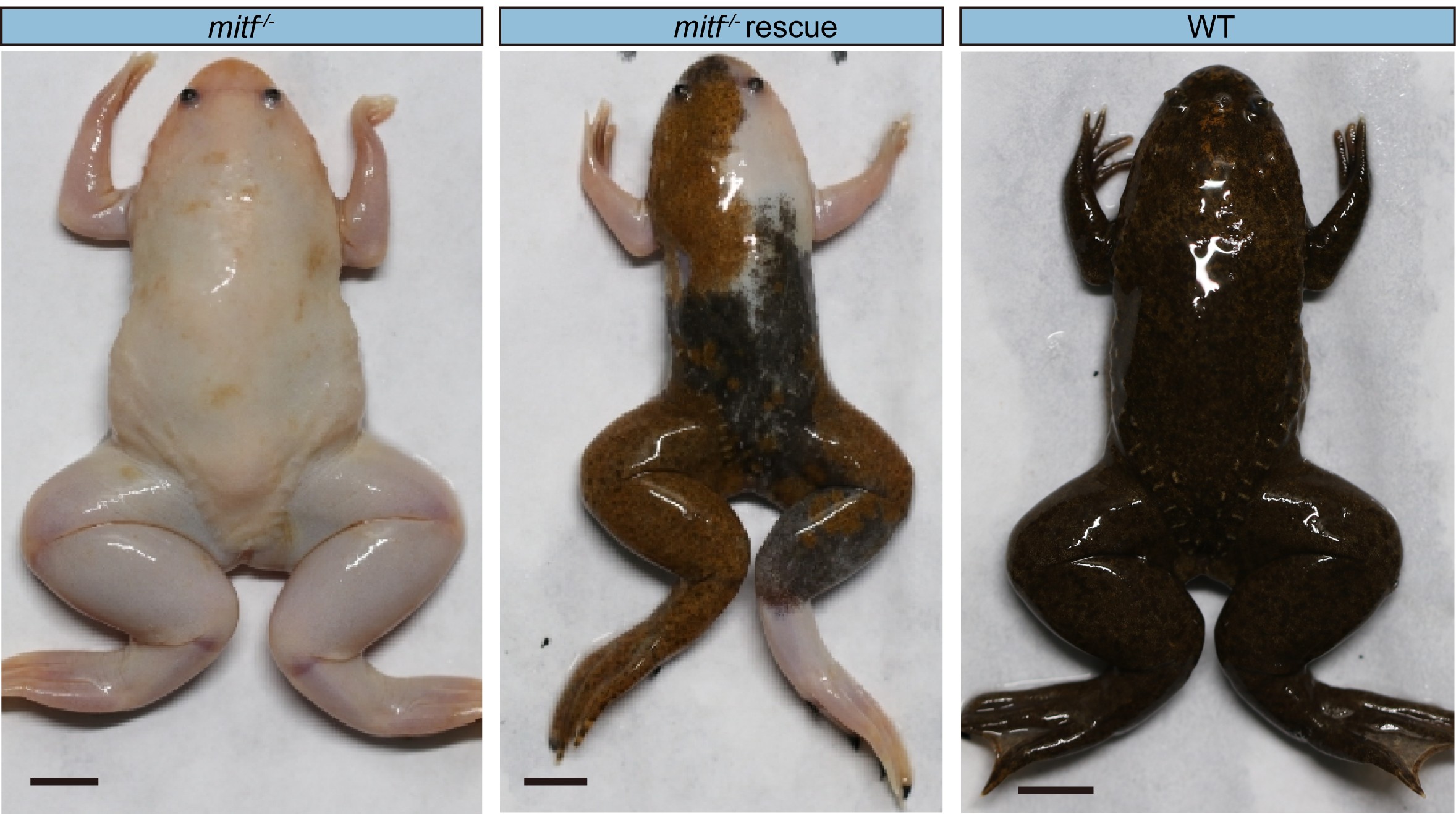 Supplementary Figure S8. The dorsal views of adult WT, mitf-knockout (mitf-/-), and mitf-/- rescue Xenopus tropicalis were compared. At least 100 frogs were analyzed for each group, except for the mitf-/- rescue. The scale bar represents 5 mm |