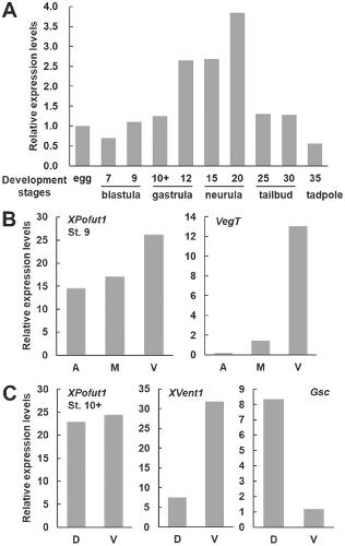 Fig. 1. Expression patterns of XPofut1. Total RNAs from embryos or regions of embryos at indicated stages were isolated, the transcript levels of XPofut1 were analyzed by RT-PCR and normalized with those of EF1. (A) Comparison of the levels of XPofut1 transcripts in unfertilized egg, blastula (stages 7 and 9), gastrula (stages 10+ and 12), neurula (stages 15 and 20), tailbud (stages 25 and 30), and tadpole (stage 35). (B) Stage 9 embryos were divided into the animal (A), marginal (M), and vegetal (V) regions. The levels of VegT (a ventral marker) transcripts are compared to confirm the accuracy of dissection. (C) Stage 10 embryos were divided into the dorsal (D) and vegetal (V) halves. The levels of Gsc (a dorsal marker) and XVent1 (a ventral marker) transcripts are compared to confirm the accuracy of dissection. |