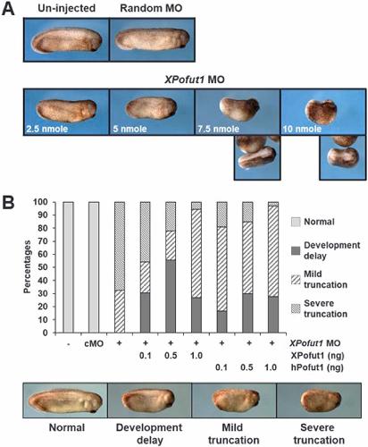 Fig. 3. XPofut1 knockdown causes axial truncation. (A) Indicated amounts of XPofut1 (2.5-10nmole/embryo) or control random MO (10nmole/embryo) were injected into the marginal regions at 2-cell stage and the embryos were cultured until stage 27. Photographs of representative embryos are shown. (B) Indicated combinations of XPofut1 or control random MO (cMO) (5nmole/embryo), Sec-hPOFUT1 or Sec-XPofut1 mRNA (ng/embryo) were coinjected into the marginal regions at 2-cell stage. The embryos were cultured until stage 27 and scored for phenotypes. Photographs of representative embryos for each category of phenotype are shown, and percentages of embryos to each category are tabulated. |