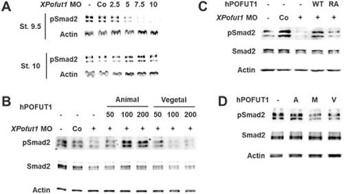Fig. 5. XPofut1 is important for Smad2 phosphorylation in early embryos. (A) Two-cell-stage embryos were injected into marginal regions with random MO (Co, 10 nmole/embryo) or indicated amounts of XPofut1 MO (nmole/embryo), and cultured until stage 9.5 or 10. The levels of phosphorylated Smad2 (pSmad2) are compared by immunoblotting. Actin is used as loading control. (B-D) Microinjected embryos were cultured until stage 9.5 and harvested to analyze the levels of phosphorylated Smad2 (pSmad2) by immunoblotting. Levels of total Smad2 (Smad2) are also compared and actin is used as a loading control. (B) Random control (Co) or XPofut1 MO (5 nmole/embryo) was injected into marginal regions at 2-cell stage, and then indicated amounts (pg/embryo) of hPOFUT1 mRNA were injected into either 4 animal blastomeres (Animal) or 4 vegetal blastomeres (Vegetal) at 8-cell stage. (C) Random control or XPofut1 MO (5 nmole/embryo) was injected into the marginal region at 2-cell stage, and then mRNA encoding wild-type (WT) or glycosyltransferase-defective mutant form (RA) of hPOFUT1 (100 pg/embryo) was injected into 4 animal blastomeres at 8-cell stage. (D) hPOFUT1 mRNA (100 pg/embryo) was injected into 4 animal blastomeres at 8-cell stage (A), into marginal regions at 2-cell stage (M), or into 4 vegetal blastomeres at 8-cell stage (V). |
