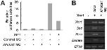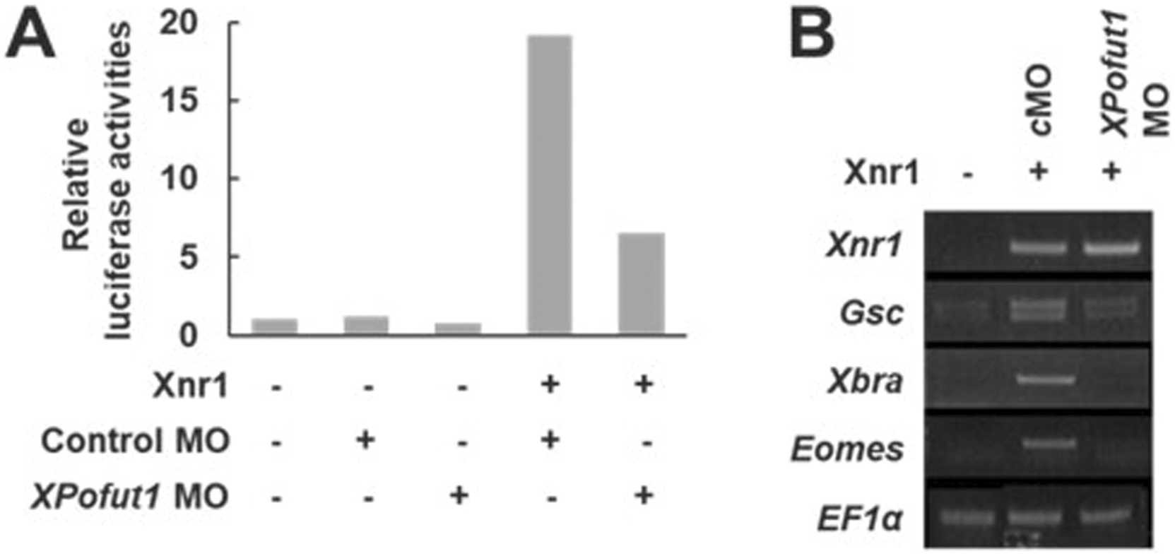 Fig. 4. XPofut1 is involved in Xnr1 signal transduction. (A) A3-Luc reporter plasmid (50pg/embryo) was injected into animal regions at 2-cell stage with indicated combinations of control random or XPofut1 MO (5nmole/embryo) and Xnr1 mRNA (125pg/embryo). Animal caps were explanted at stage 8.5, cultured until stage 9.5, and harvested to analyze luciferase activities. (B) Indicated combinations of control random (cMO) or XPofut1 MO (5nmole/embryo) and Xnr1 mRNA (125pg/embryo) were injected into animal regions of 2-cell-stage embryos. Animal caps were explanted at stage 8.5, cultured until stage 9.5, and harvested for RT-PCR analysis. EF1 is used as a loading control. |