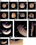Fig. 2. Spatial expression patterns of XPofut1. Whole-mount in situ hybridization was performed with embryos of indicated stages. Photographs of representative embryos are shown. (A) Stage 12, vegetal view, dorsal side is toward the top. (B-D) Stage 18, anterior view, dorsal side is toward the top (B), lateral view, dorsal side is toward the top (C), and dorsal view, anterior side is toward the top (D). (E and F) Stage 20, anterior view, dorsal side is toward the top (E) and dorsal view, anterior side is toward the top (F). (G and H) Stage 24, lateral view (G), and dorsal view (H). (I-K) Stage 30, lateral view (I), higher magnification of anterior region (J), and dorsal view (K). (L and M) Stage 37, lateral view (L) and higher magnification of dorsal region (M). ap, auditory placode; ba, branchial arch; bp, blastopore; e, eye; mc, mesencephalon, ng, neural groove; np, neural plate; ns, nephrostome; op, optic placode; ov, optic vesicle; pd, pronephric duct; pn, pronephros; pt, pronephric tubule; rc, rhombencephalon; s, somite. |