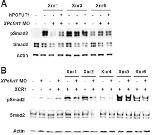 Fig. 6. XPofut1 regulates Xnr1 and Xnr5/6 signaling differently. Embryos were injected with indicated combinations of MO and mRNA. Animal caps were explanted at stage 8.5, cultured until stage 9.5, and harvested to analyze the levels of phosphorylated Smad2 (pSmad2) by immunoblotting. Levels of total Smad2 (Smad2) are also compared and actin is used as a loading control. (A) Embryos were injected into marginal regions with indicated combinations of XPofut1 MO (5 nmole/embryo) and mRNAs encoding Xnr1 (125 pg/embryo), Xnr5 (40 pg/embryo), or Xnr6 (300 pg/embryo) at 2-cell stage, and then injected into 4 animal blastomeres with hPOFUT1 mRNA (100 pg/embryo) at 8-cell stage. (B) Embryos were injected into marginal regions with indicated combinations of XPofut1 MO (5 nmole/embryo) and mRNAs encoding Xnr1 (125 pg/embryo), Xnr2 (20 pg/embryo), Xnr4 (100 pg/embryo), Xnr5 (40 pg/embryo), Xnr6 (300 pg/embryo), or XCR1 (250 pg/embryo) at 2-cell stage. |