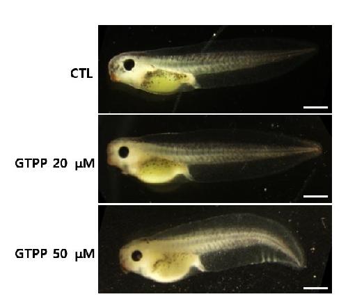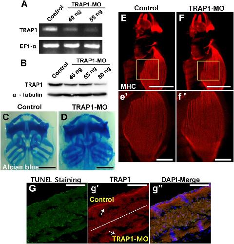 TNF receptor-associated protein1 (TRAP1) is a mitochondrial molecular chaperon with high homology with a cytosolic chaperon HSP90. It has been shown that TRAP1 functions as an inhibitor for apoptosis by preventing cytochrome-c release from mitochondria. In addition, TRAP1 seems to play critical roles in metabolic processes for energy production, such as glycolysis and β-oxidation. It has also been reported that TRAP1 is a direct target of PTEN-induced kinase 1 (PINK1) and may be a cause of Parkinson's disease (PD) in humans. Although the biochemical functions of TRAP1 are under intense study for the physiology and treatment of various cancers, its roles in vertebrate development have not been reported. This study shows that Xenopus TRAP1 is strongly expressed in the developing muscle, kidney, and brain tissues. Perturbation of TRAP1 function by treating TRAP1 inhibiter GTPP or microinjection of antisense-morpholino oligo (MO) caused mild defects in striated muscle fiber formation. Furthermore, the looping patterns of developing kidney tubules were perturbed, indicating that TRAP1 function is necessary for proper kidney development.