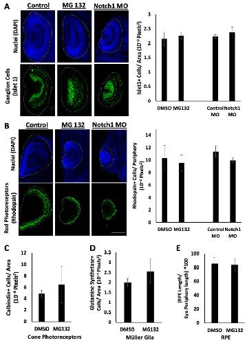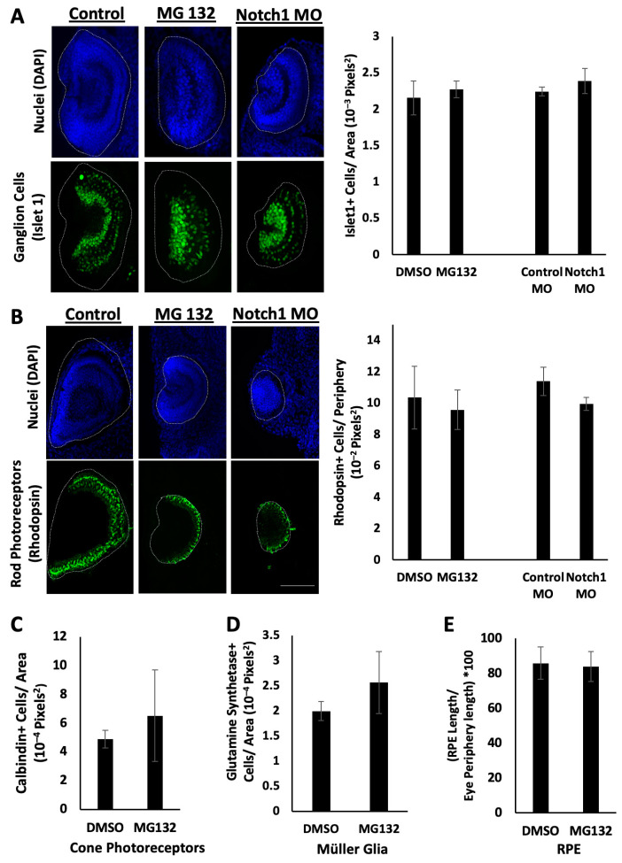 Figure 3. Retinal differentiation during Notch inhibition. (A) Transverse eye sections of regrowing and inhibited eyes at 3 dps. The top panels indicate nuclei. The bottom panels indicate ganglion and inner nuclear layer cells. The graph shows Islet1-positive cells per eye area. (B) Transverse eye sections of regrowing and inhibited eyes at 3 dps. The top panels indicate nuclei. The bottom panels indicate rod photoreceptor cells. The graph shows the number of Rhodopsin-positive cells along the periphery of the eye. Dotted lines outline the eye region. All eyes were sectioned medially facing left. (C) Graph comparing Calbindin-positive cells in control regrowing and Notch-inhibited eye. (D) Graph comparing Glutamine Synthetase-positive cells in control regrowing and Notch-inhibited eyes. (E) Graph comparing the percentage of the regrown eye periphery occupied by the RPE in control regrowing and Notch-inhibited eyes (n > 3 per condition, p > 0.05). Images at 20×. Scale bar = 100 μm. Up = dorsal and left = anterior.