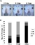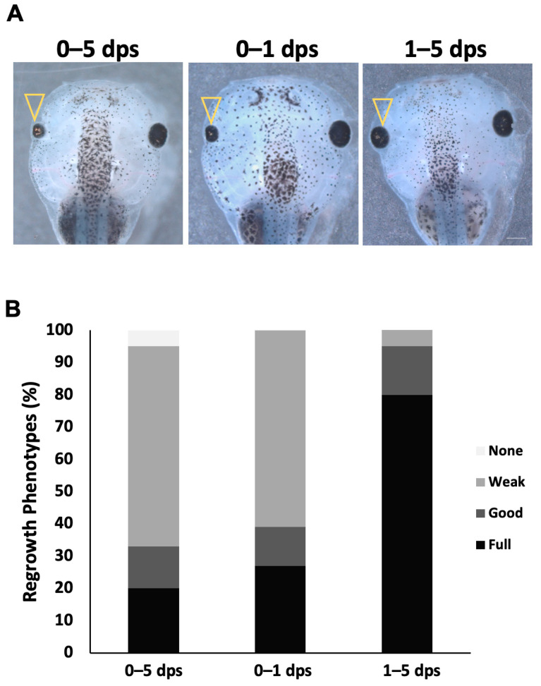 Figure 2. Notch is required during the first day of regrowth. (A) Comparison of regrown eyes at 5-dps following treatment of MG132 for variable durations from the time of surgery (n > 30 per condition). Open arrowheads indicate a regrown eye. Up = anterior, images at 20.5×. Scale bar = 500 μm. (B) Graphical representation of the percentage of regrowth phenotypes at 5 dps.