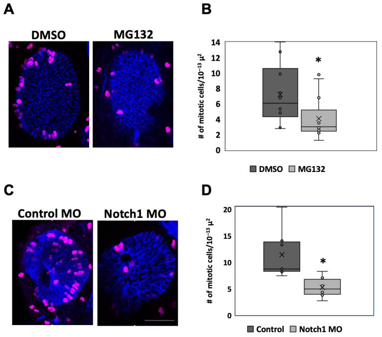 Figure 4. Reduction in Notch during eye regrowth reduces proliferation. (A) Transverse eye sections at 1 dps showing mitosis cells in DMSO or MG132-treated eyes (n > 5 per condition). Magenta = phosphorylated Histone 3, Blue = Xen1. Images at 20×. (B). Box and whisker plot comparing the number of H3P-positive cells normalized to area. (C) Transverse eye sections at 1 dps comparing proliferating cells in control morpholino and Notch1 morpholino injected eyes (n > 5 per condition). Magenta = phosphorylated Histone 3, Blue = Xen1. Images at 20×. Scale bar= 100 μm. (D) Box and whisker plot comparing number of H3P-positive cells normalized to area. * = p < 0.01. Up = dorsal and left = anterior.