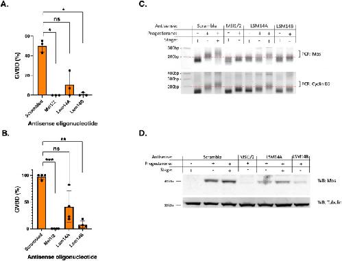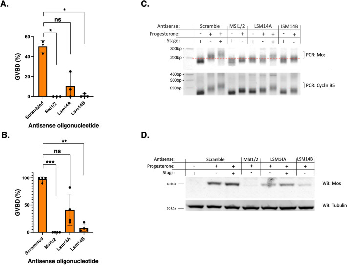 Fig. 1. Knockdown of LSM14B attenuates Xenopus oocyte maturation and Musashi-dependent polyadenylation and translation. After microinjection of the indicated antisense oligonucleotides and incubation overnight, oocytes were stimulated with progesterone. When 50% (A) or 100% (B) of Scrambled control antisense-injected oocytes had matured (germinal vesicle breakdown, GVBD), the degree of maturation in the knockdown groups was assessed. The statistical significance over repeated independent experiments is indicated: *, p < 0.05; **, p < 0.01; ***, P, 0.001; and ns, not significant. (C) Polyadenylation analysis of endogenous Mos and Cyclin B5 mRNA polyadenylation. Oocytes were injected with the indicated knockdown antisense oligonucleotides and incubated overnight. A portion of oocytes from each condition were harvested prior to progesterone stimulation (immature, I). The remaining cohorts were stimulated with progesterone and samples were collected when Scrambled control antisense-injected oocytes reached 50% maturation (GVBD50) and segregated into those which had not (−) or had ( +) completed GVBD (see Stage). No maturation was seen in MSI1/2- or LSM14B-knockdown oocytes. In these experiments, an increase in poly[A] tail length is indicated by a larger heterogeneously sized PCR product. (D) Oocytes were injected and harvested as described for (C) but the samples were lysed and analyzed by western blot for Mos protein (WB: Mos) and tubulin (WB: Tubulin) as an internal loading control.