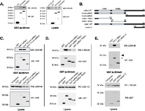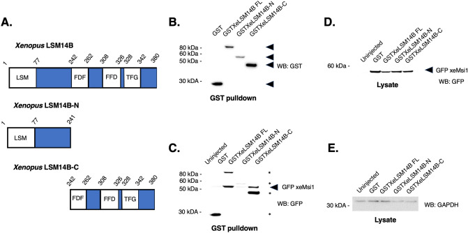 Fig. 3. The C-terminal domain of LSM14B interacts with Musashi1. (A) A schematic representation of Xenopus laevis full length, N-terminal, and C-terminal LSM14B proteins with the LSM, FDF, FFD, and TFG domains indicated. Oocytes were co-injected with RNA encoding GFP-tagged Xenopus MSI1 and either the GST moiety alone (GST), GST tagged Xenopus LSM14B full length (GSTXeLSM14B), GST tagged Xenopus N-terminal LSM14B (GSTXeLSM14B-N), or GST tagged Xenopus C-terminal LSM14B (GSTXeLSM14B-C) and incubated overnight. The next morning, the oocytes were lysed, subjected to glutathione Sepharose pulldown, and analyzed by western blot for recovery of the GST tagged proteins (B). For all pulldown experiments, the beads were washed in buffer containing RNase1 to eliminate RNA-dependent co-associations. (C) The blot from (B) was re-probed for GFP to visualize any co-association of the GST tagged LSM14B proteins with GFP tagged Xenopus Msi1 (Arrowhed). Bands marked with an asterisk persist from the prior GST western. (D) Oocyte lysates were also analyzed by western blot for expression of the GFP tagged MS1 protein. (E) Oocyte lysates were also analyzed by western blot for GAPDH as a loading control. For the lysate westerns, an uninjected oocyte lysate was included. Representative experiments are shown.