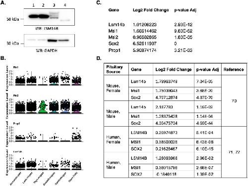 Fig. 4. LSM14B is expressed in the murine pituitary. (A) Protein lysates were prepared from Immature (lane 1) or mature (lane 2) Xenopus oocytes, murine NIH3T3 cells (lane 3) or mouse pituitary (lane 4) and analyzed by western blotting for LSM14B (WB:LSM14B) or GAPDH (WB:GAPDH) as an internal loading control. (B) Reanalysis of published scRNA-seq datasets reveals co-expression of Musashi1 (MSI1), Musashi2 (MSI2), Prop1 (PROP1) and Lsm14b (LSM14B) in Sox2 stem cells and across all pituitary endocrine cell lineages in the male mouse. (C) Differential expressed gene analysis of the same data shown in (B) reveals statistically significant enrichment of Lsm14b, Msi1, Msi2, Prop1 together in the Sox2 cell cluster. (D) Differential expressed gene analysis of additional male and female mouse and human pediatric pituitaries reveals statistically significant enrichment of Lsm14B and Musashi1 within the same cell cluster.