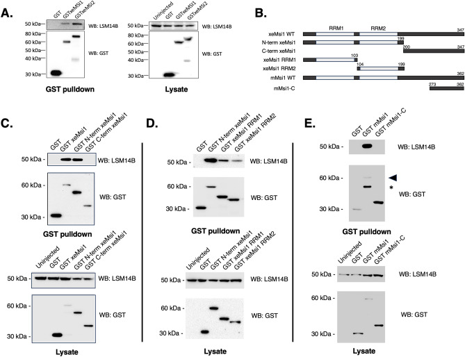 Fig. 2. LSM14B interacts with Musashi in an RNA-independent manner. (A) Oocytes were injected with RNA encoding either the GST moiety alone (GST), GST tagged Xenopus Musashi1 (GSTXeMSI1) or GST tagged Xenopus Musashi2 (GSTXeMSI2) and incubated overnight. The next morning, the oocytes were lysed and either analyzed by western blot for expression of the GST tagged proteins and endogenous LSM14B (right panel, Lysate) or subjected to glutathione Sepharose pulldown and analyzed by western blot for co-association of the GST-tagged protein with endogenous LSM14B protein and recovery of GST tagged proteins (GST pulldown). (B) Schematic showing the Xenopus and murine Musashi1 constructs employed for LSM14B interaction mapping experiments (panels C-E). (C) Oocytes were injected with RNA encoding the GST moiety alone, GSTXeMSI1 or the N- or C-terminal regions of XeMSI1 and the interaction with endogenous LSM14B assessed after glutathione pulldown as described in (A). (D) Oocytes were injected with RNA encoding the GST moiety alone, GST fused to the N-terminal region of XeMSI1 (GST N-term XeMSI1) or GST fused to the N-terminal RRM1 or RRM2 domains and the interaction with endogenous LSM14B assessed after glutathione pulldown. (E) Oocytes were injected with RNA encoding the GST moiety alone, GST fused to the murine MSI1 (GST mMSI1) or the murine C-terminal domain (GST mMSI1-C) and the interaction with endogenous LSM14B was assessed after glutathione pulldown. Arrowhead indicates full length GST-mMSI1; Asterisk indicates a degradation product of GST-mMSI1. For all pulldown experiments, the expression of the GST fusion proteins and levels of endogenous LSM14B were separately assessed in each experiment (see Lysate panels). For all pulldown experiments, the beads were washed in buffer containing RNase1 to eliminate RNA-dependent co-associations. Representative experiments are shown.