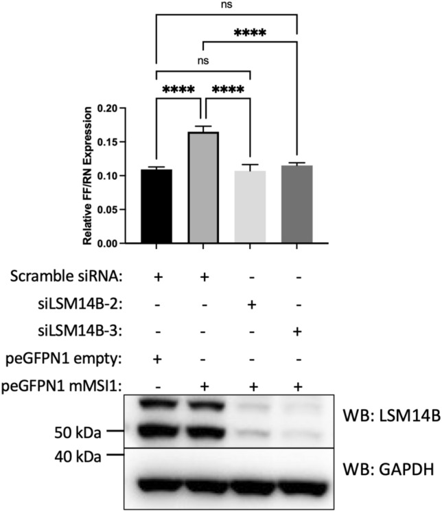 Fig. 5. LSM14B is necessary for Musashi-dependent translational activation exerted through the murine Prop1 3’ UTR. NIH3T3 cells were initially transfected with either scrambled control siRNA or two separate siRNAs (siLSM14B-2 and siLSM14B-3) targeting the murine Lsm14B mRNA. One day later the cells were transfected with a luciferase reporter mRNA under the control of a Prop1 3’ UTR along with either the empty pEGFPN1 vector or the peGFPN1 vector containing murine Musashi1. Cells were lysed after a further 24-h incubation and one aliquot assessed for reporter mRNA luciferase activity (upper graph) and the other aliquot assessed for endogenous LSM14B protein expression by western blot (lower panels). In these experiments, LSM14B ran as a doublet. Reporter assays were repeated on three separate occasions and statistical significance assessed by ANOVA: ****, p < 0.001; ns, not significant. GAPDH was used as a protein loading control in the western blot.