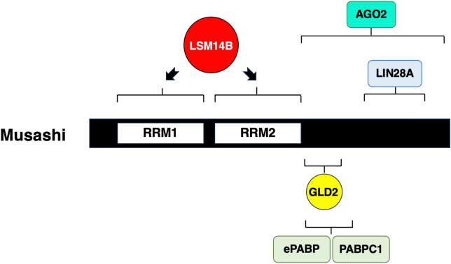 Fig. 6. Schematic interaction map of characterized Musashi co-associated proteins. The relative domains on Musashi responsible for interaction with AGO2, LIN28A, GLD2, ePABP, PABPC1 and LSM14B are shown. LSM14B is currently the only characterized protein that interacts exclusively with the N-terminal domain of Musashi.