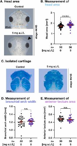 Fig. 3. Influence of Tebucur on head area and cranial cartilage of X. laevis embryos. A. Head area. Dorsal images of X. laevis embryos at stage 44/45 (control and 5mg a.i./L). B. Measurement of head area. Statistical analysis of head area (blue dotted line in A) of embryos treated with control solution and 5mg a.i./L Tebucur (N=2, n=58). Exposure to 5mg a.i./L Tebucur led to a significant increase in head area (black arrow in A). C. Isolated cartilage. Ventral images of cranial carti of X. laevis embryos at stage 44/45 (control and 5mg a.i./L). D. Measurement of branchial arch width. Statistical analysis of branchial arch width (lilac dotted line in C) of embryos treated with control solution and 5mg a.i./L Tebucur (N=2, n=3335). E. Measurement of anterior tectum area. Statistical analysis of anterior tectum area (pink dotted line in C) of embryos treated with control solution and 5mg a.i./L Tebucur (N=2, n=2830). Abbreviations: mg a.i./L: milligram active ingredient (tebuconazole) per liter, mm: millimeter, mm2: square millimeter, n: number of evaluated embryos in total, n.s.: not significant, m: micrometer. |