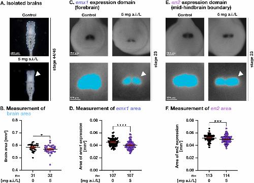Fig. 4. Disruption of neural development of X. laevis embryos after Tebucur exposure. A. Isolated brains. Dorsal images of isolated X. laevis brains at stage 44/45 (control and 5mg a.i./L). B. Measurement of brain area. Statistical analysis of brain area (blue dotted line in A) of embryos treated with control solution and 5mg a.i./L Tebucur (N=2, n=3132). Exposure to 5mg a.i./L Tebucur led to a reduction in brain area (white arrow in A). C. emx1 expression domain (forebrain). Anterior images of forebrain-development gene emx1 expression domain (upper row: overview; lower row: area in blue) at stage 23 (control and 5mg a.i./L). D. Measurement of emx1 area. Statistical analysis of emx1 expression domain area (blue area in C) of embryos treated with control solution and 5mg a.i./L Tebucur (N=4, n=107). The emx1 expression domain area was significantly smaller after Tebucur treatment (white arrow in C). E. en2 expression domain (mid-hindbrain boundary). Anterior images of mid-hindbrain-development gene en2 expression domain (upper row: overview; lower row: area in blue) at stage 23 (control and 5mg a.i./L). F. Measurement of en2 area. Statistical analysis of en2 expression domain area (blue area in E) of embryos treated with control solution and 5mg a.i./L Tebucur (N=4, n=113114). Exposure to 5mg a.i./L Tebucur led to a significant reduction in en2 expression domain area (white arrow in E). Abbreviations: emx1: empty spiracles homeobox 1, en2: engrailed homeobox 2, mg a.i./L: milligram active ingredient (tebuconazole) per liter, mm2: square millimeter, n: number of evaluated embryos in total, m: micrometer. |