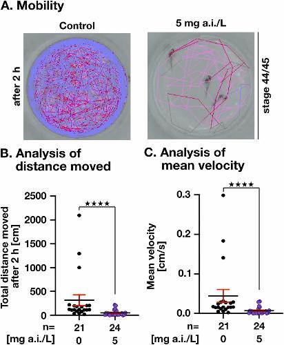 Fig. 6. Mobility of X. laevis embryos after a 14-day exposure to Tebucur. A. Mobility. Generated illustration showing the tracked mobility of X. laevis embryos at stage 44/45 after 2hours (control and 5mg a.i./L). B. Analysis of distance moved. Statistical analysis of embryos treated with control solution and 5mg a.i./L Tebucur investigating the distance moved during 2hours (N=2, n=2124). Exposure to 5mg a.i./L Tebucur led to a significant reduction in moving distance. C. Analysis of mean velocity. Statistical analysis of embryos treated with control solution and 5mg a.i./L Tebucur investigating the mean velocity during 2hours movement time (N=2, n=2124). Embryos exposed to Tebucur were significantly slower compared to the control. Abbreviations: cm: centimeter, cm/s: centimeter per second, mg a.i./L: milligram active ingredient (tebuconazole) per liter, n: number of evaluated embryos in total. |