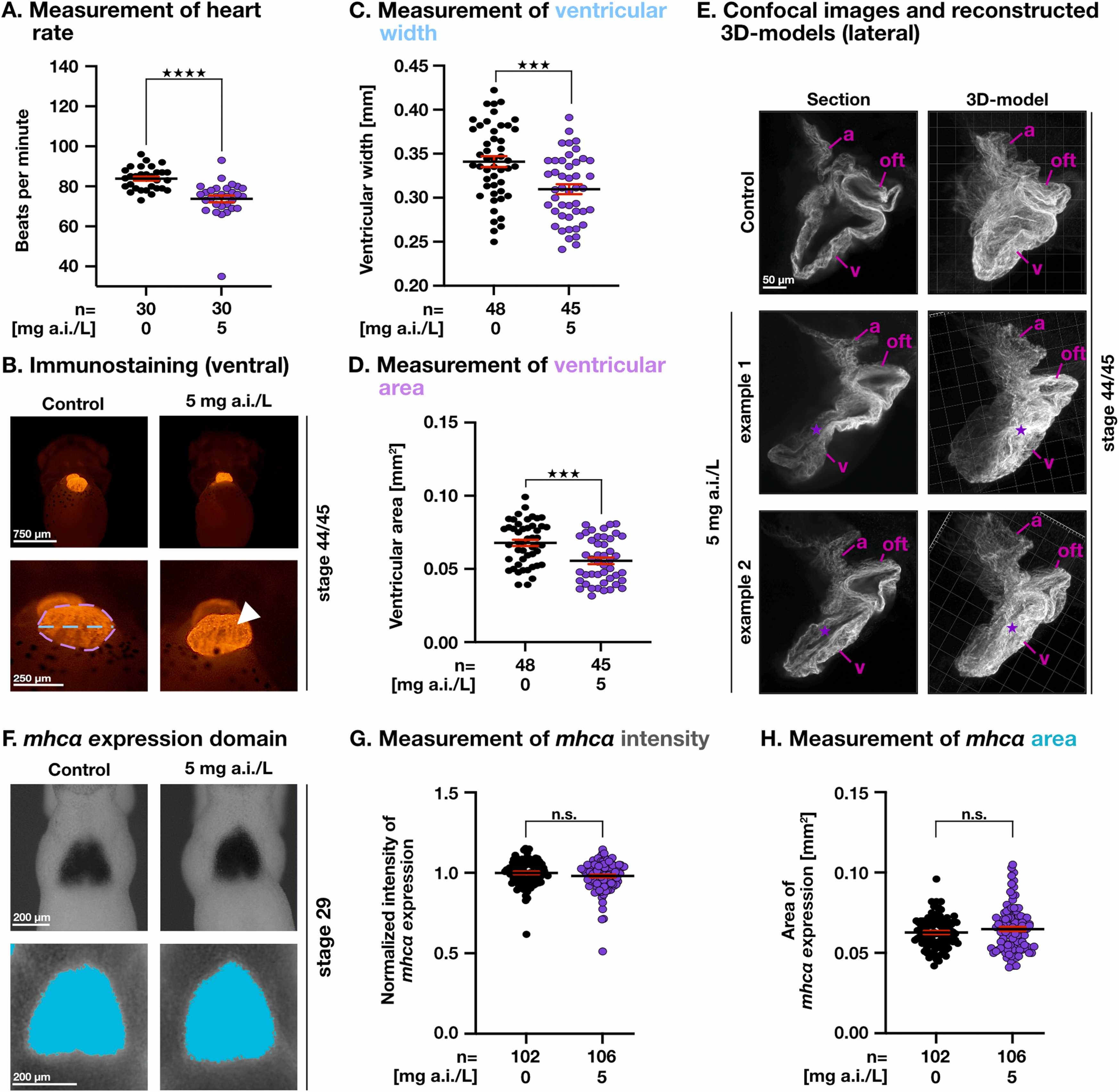 Fig. 5. Impact of Tebucur on cardiac development of X. laevis embryos. A. Measurement of heart rate. Statistical analysis of measured heart rates of embryos at stage 44/45 treated with control solution and 5mg a.i./L Tebucur (N=2, n=30). A significant decrease in heart rate after a 14-day exposure to Tebucur was observed. B. Immunostaining (ventral). Ventral images of Tnnt2-immunostained X. laevis embryos at stage 44/45 (control and 5mg a.i./L). C. Measurement of ventricular width. Statistical analysis of ventricular width (blue dotted line in B) of embryos treated with control solution and 5mg a.i./L Tebucur (N=2, n=4548). Embryos treated with Tebucur showed a significant decrease in ventricular width (white arrow in B). D. Measurement of ventricular area. Statistical analysis of ventricular area (pink dotted line in B) of embryos treated with control solution and 5mg a.i./L Tebucur (N=2, n=4548). Exposure to Tebucur significantly reduced the ventricular area (white arrow in B). E. Confocal images and reconstructed 3D-models (lateral). Section views (left column) and reconstructed 3D-models (right column) of one control and two exemplary exposed (5mg a.i./L) X. laevis hearts after Tnnt2 staining, using confocal imaging at stage 44/45. Tebucur treatment led to reduced ventricular volume (lilac stars). F. mhc expression domain. Ventral images of myocardial gene mhc expression domain (upper row: overview; lower row: area in blue) at stage 29 (control and 5mg a.i./L). G. Measurement of mhc intensity. Statistical analysis of mhc expression intensity (grey area in F, upper row) of embryos treated with control solution and 5mg a.i./L Tebucur (N=4, n=102106). H. Measurement of mhc area. Statistical analysis of mhc expression domain area (blue area in F, lower row) of embryos treated with control solution and 5mg a.i./L Tebucur (N=4, n=102106). Abbreviations: a: atrium, mg a.i./L: milligram active ingredient (tebuconazole) per liter, mhc: myosin heavy chain alpha, mm: millimeter, mm2: square millimeter, n: number of evaluated embryos in total, n.s.: not significant, oft: outflow tract, v: ventricle, m: micrometer. |
