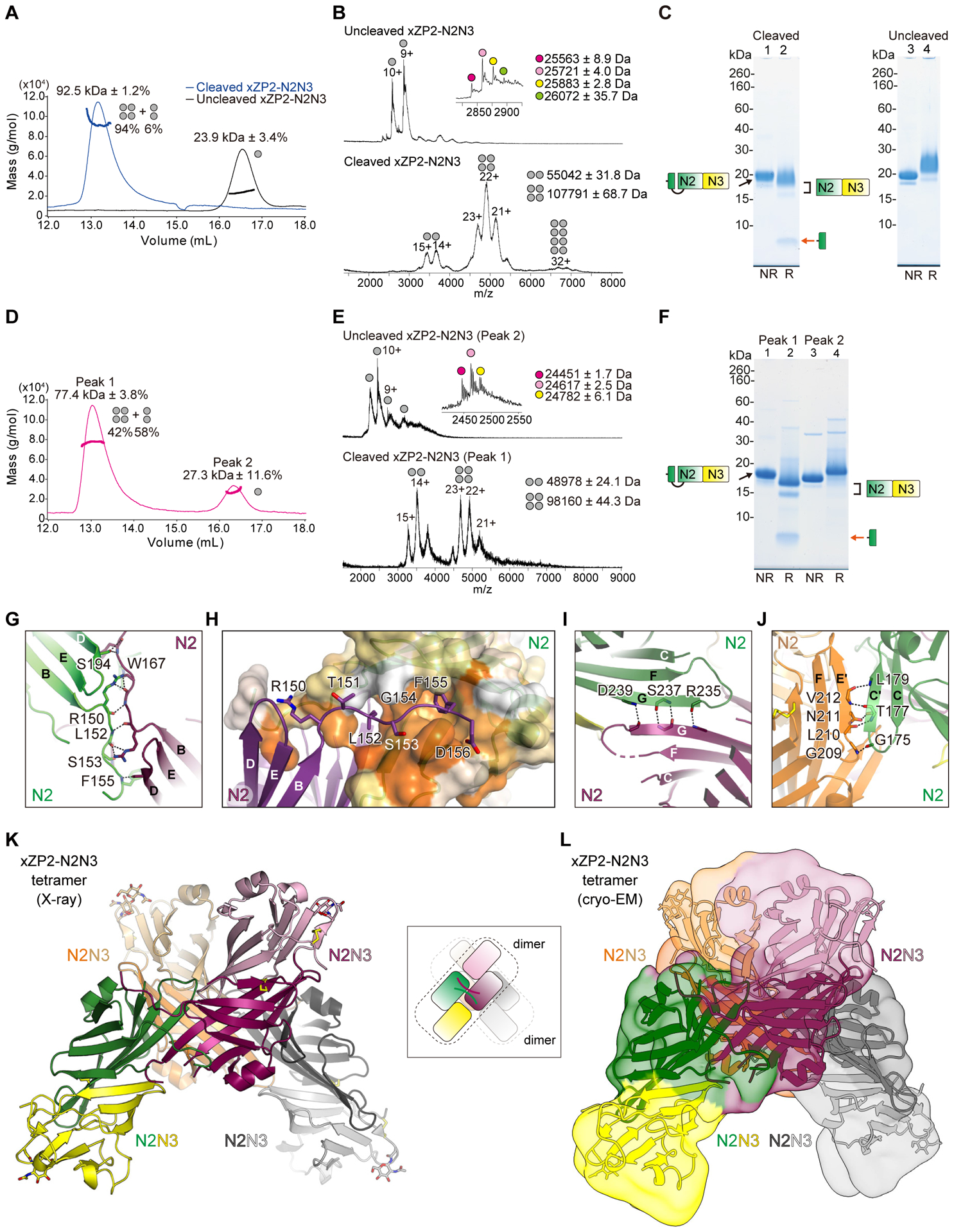 (A) SEC-MALS profile of uncleaved and collagenase-cleaved xZP2-N2N3. Gray dots indicate the oligomerization state of the protein. Protein tetramer and dimer peaks overlap, due to their very similar radiuses of gyration (deduced from the structure in panels K, L).
